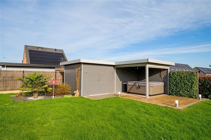 L'extérieur de cette villa vous offre des prestations à la hauteur du reste de cette construction. Vous pourrez profiter de trois terrasses en fonction de votre exposition préférée. Un grand abri de jardin de 18m² et une pergola avec des écrans BOFLEX motorisés et un éclairage intégré complètent le cadre extérieur.