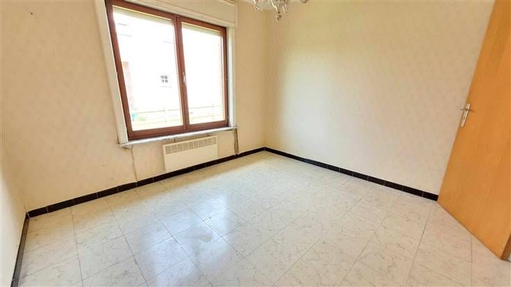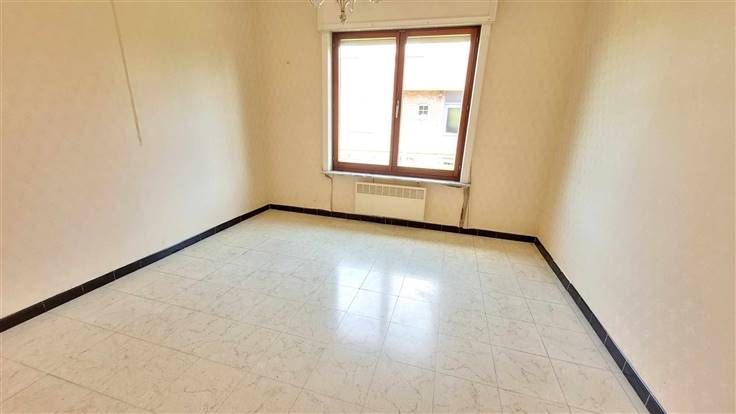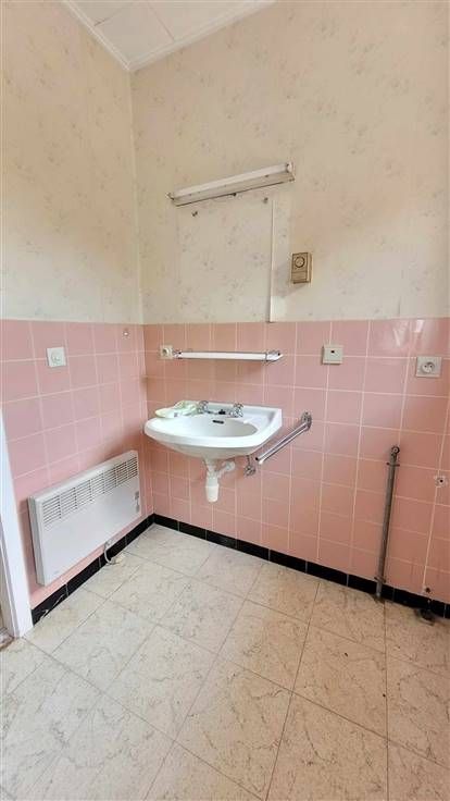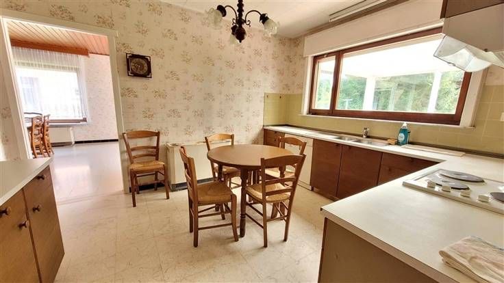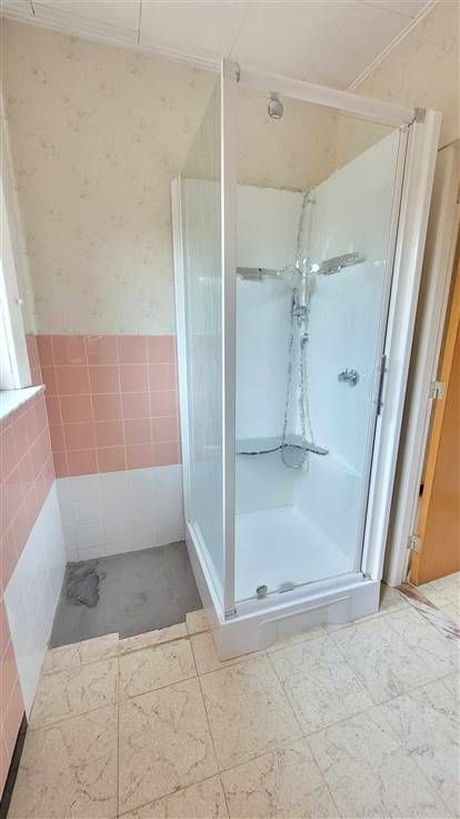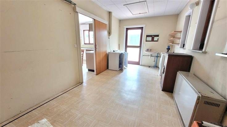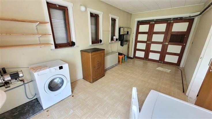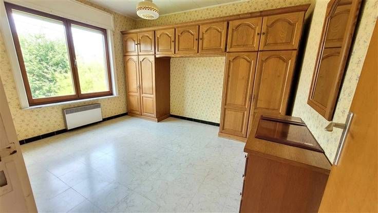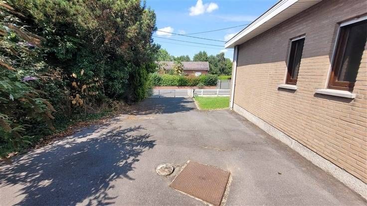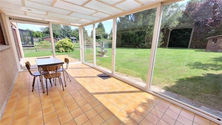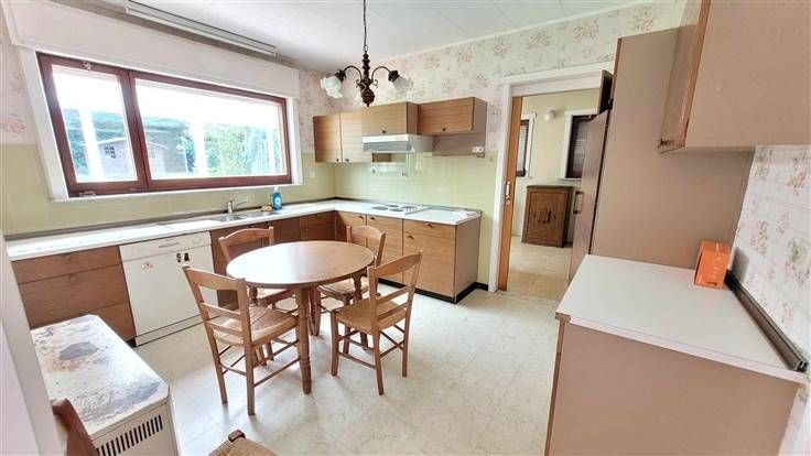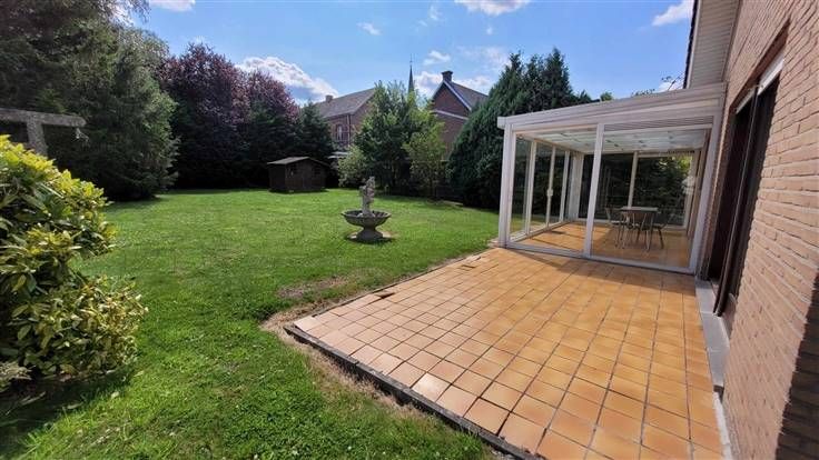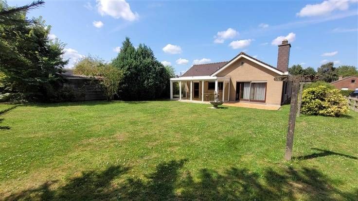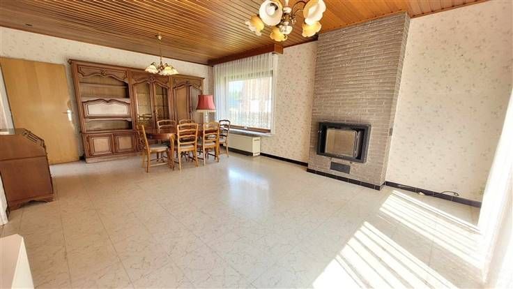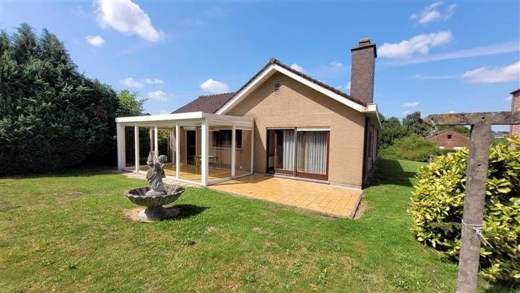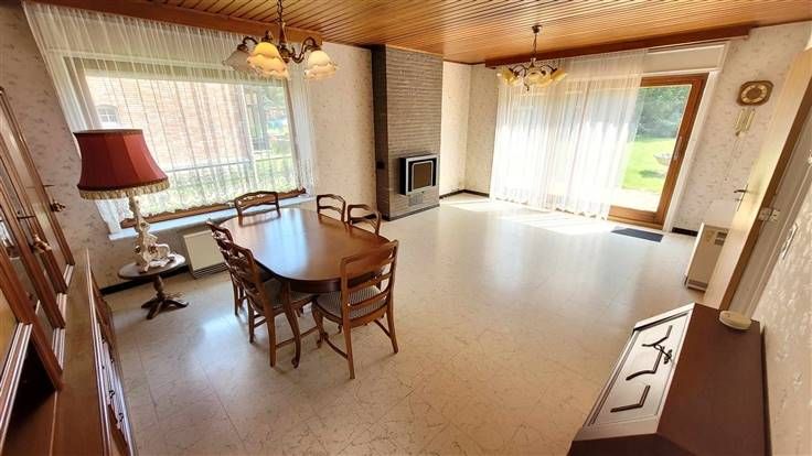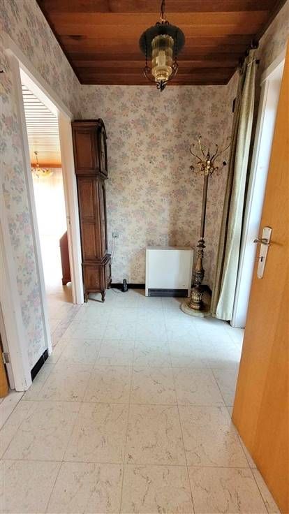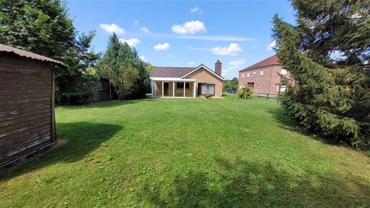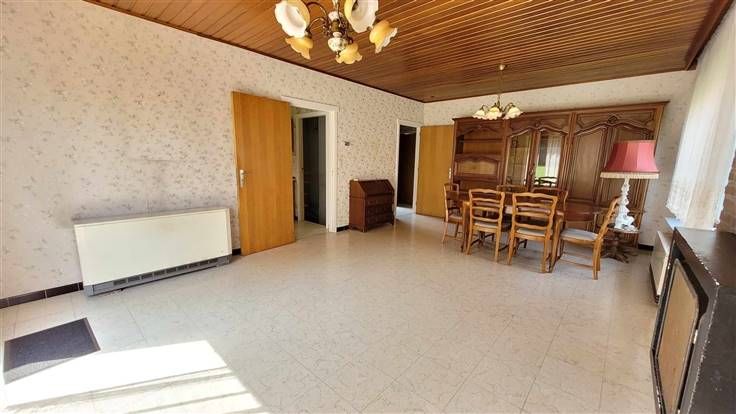 hall d'entrée, wc, couloir desservant les 3 chambres et la salle de douche. Sur l'arrière, vous trouverez le salon-sàm offrant une vue agréable sur le jardin. La cuisine est équipée et l'habitation possède également un garage et une véranda.