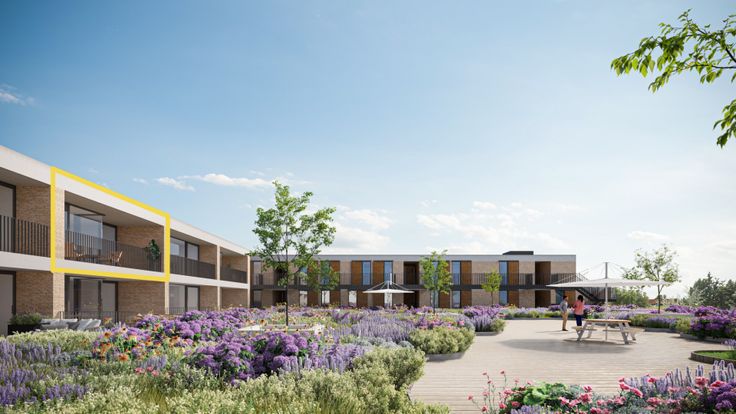 Het ruime terras met zicht op het gemeenschappelijk groendak en de verre weilanden is een van de vele troeven van dit nieuwbouwappartement.