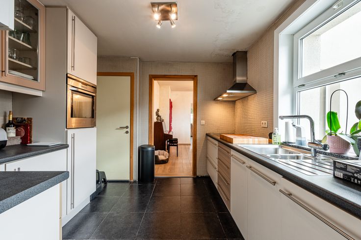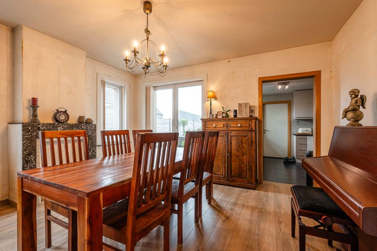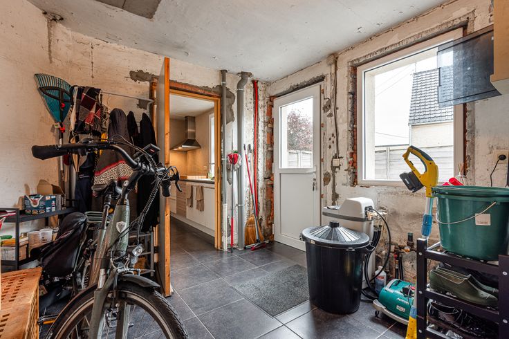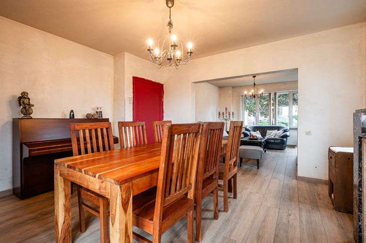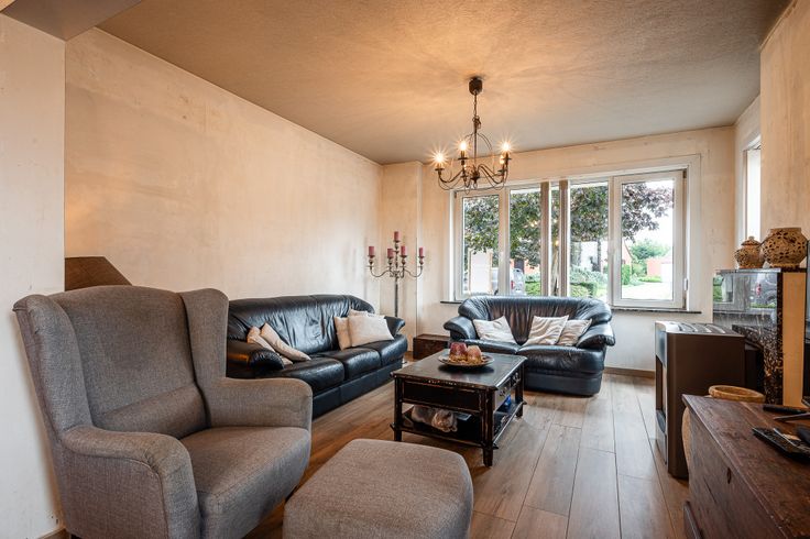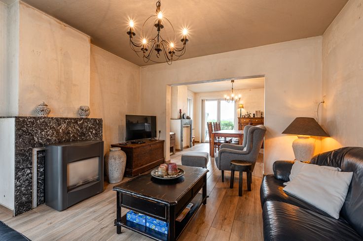 Ontdek deze deels gerenoveerde gezinswoning. Bij binnenkomst loop je via de inkomhal rechtstreeks in de ruime leefruimte. Aansluitend vind je de keuken, vanwaar je toegang hebt tot de kelder en de berging/wasplaats met apart toilet.