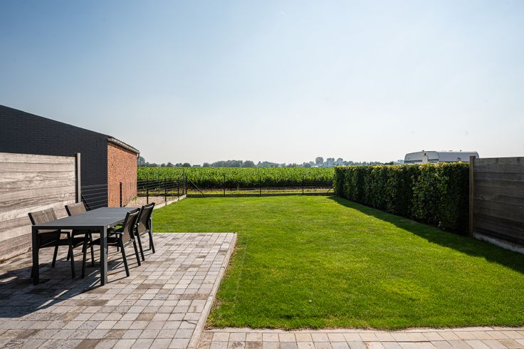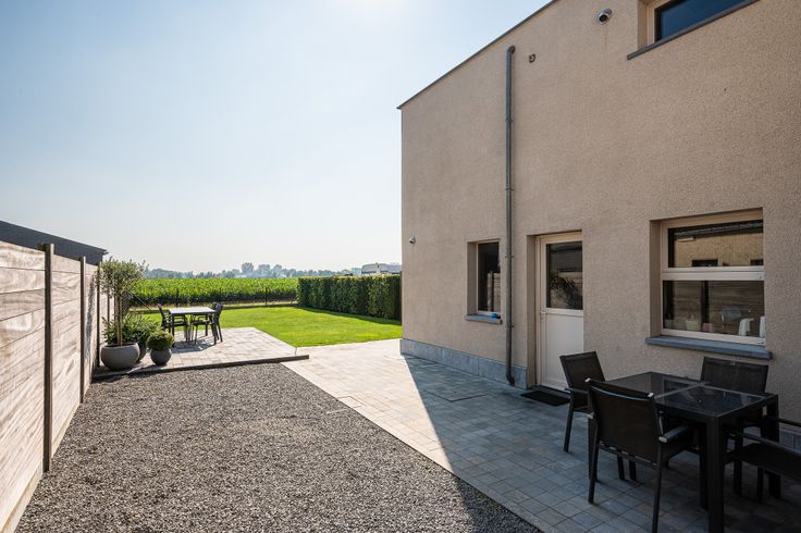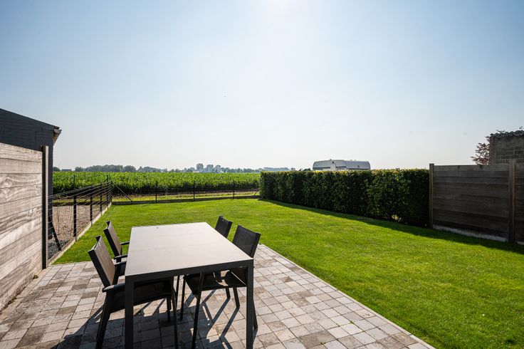 Buiten geniet je van een tuin met terras en een aangenaam zicht over de uitgestrekte velden.