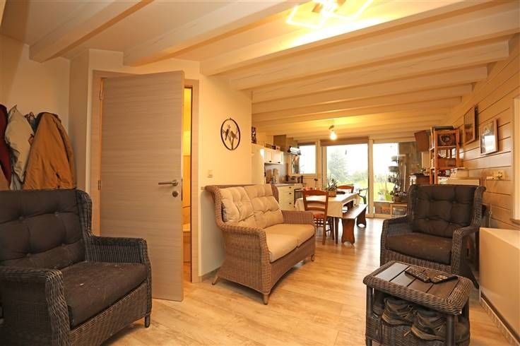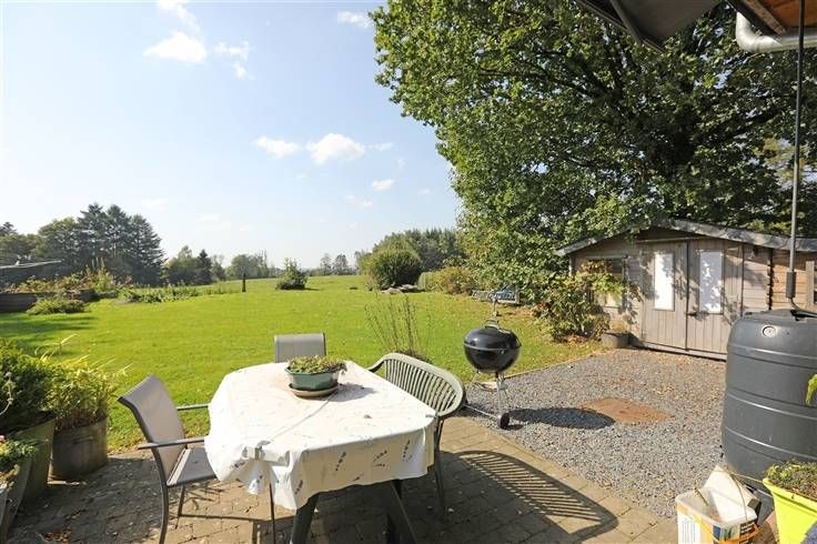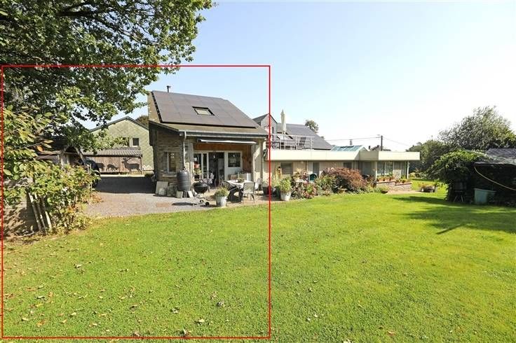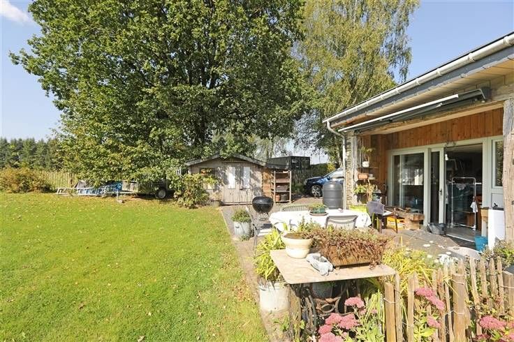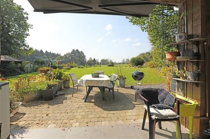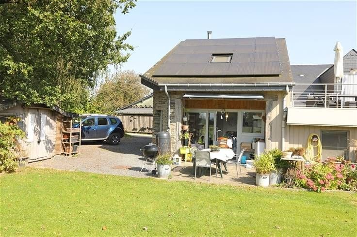 De woning ligt aan het einde van een klein straatje, aan de rand van weilanden. Het geniet aan de achterzijde van een aangenaam terrein zuid westwaarts gericht en geniet vanop het terras van een prachtig uitzicht op het Ardense landschap.