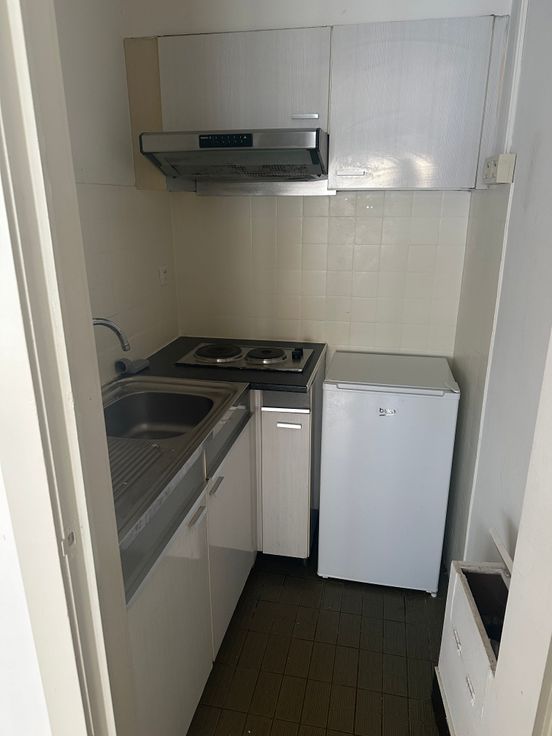 De afsluitbare keuken is voorzien van enkele kasten, kookplaat met 2 pitten een wastafel en een koelkast.