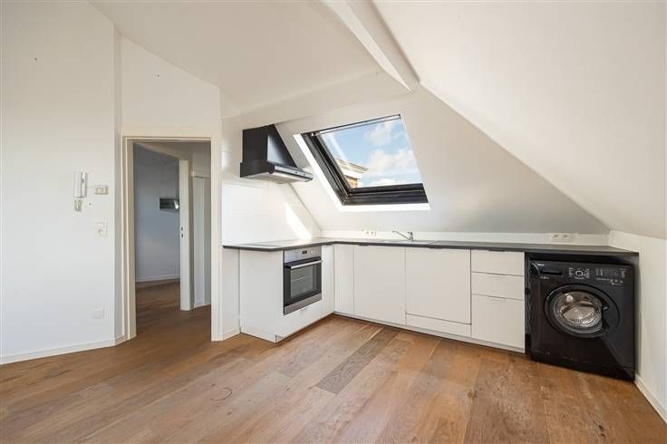 Je hebt hier plaats voor een zetel, een tafel en een bureautje, of een slim opbergmeubel dat ook dienst kan doen als zitbank, bijvoorbeeld. De keuken is tijdloos en praktisch, met witte kastfrontjes, een donkergrijs werkblad, keramische kookplaat, ingebouwde dampkap, diepvries, oven, vaatwasser en wasmachine. Weer in de hal, heb je nog een badkamer, met een douche, een lavabomeubel met spiegel, toilet en een handdoekradiatior.