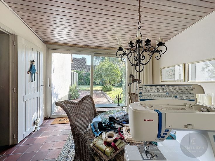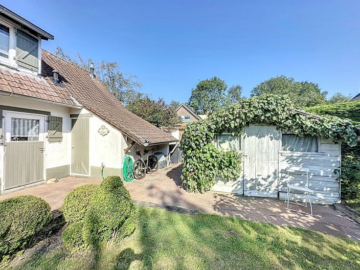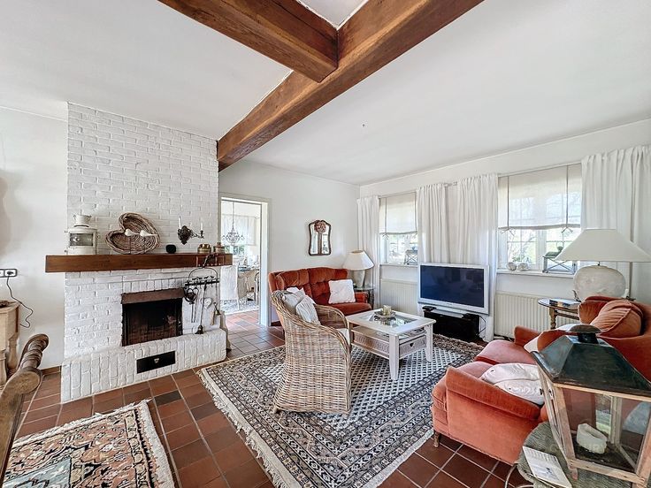 Er is een ruime inkomhal met vestiaire, badkamer met ligbad en douche, woonkamer met eetplaats en zithoek, een open keuken, groot raam naar de zonovergoten tuin! een aanbouw met veranda, een berging/wasplaats, een garage met nog extra berging.