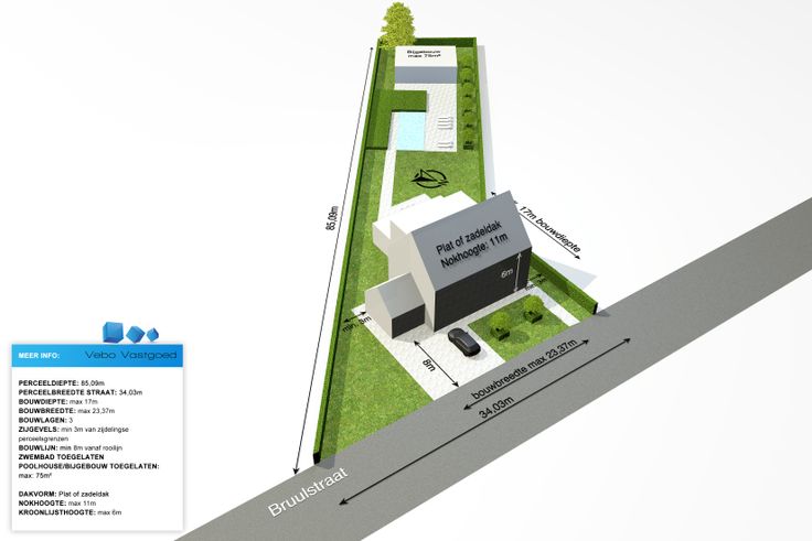 Perceelbreedte 34,03 m, perceeldiepte 85,09 m, toegelaten gevelbreedte 23,37 m, diepte gelijkvloers bedraagt 17 m en max. 3 bouwlagen toegelaten.