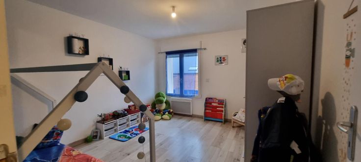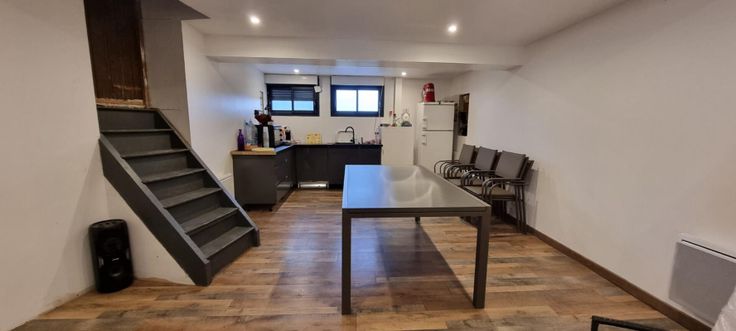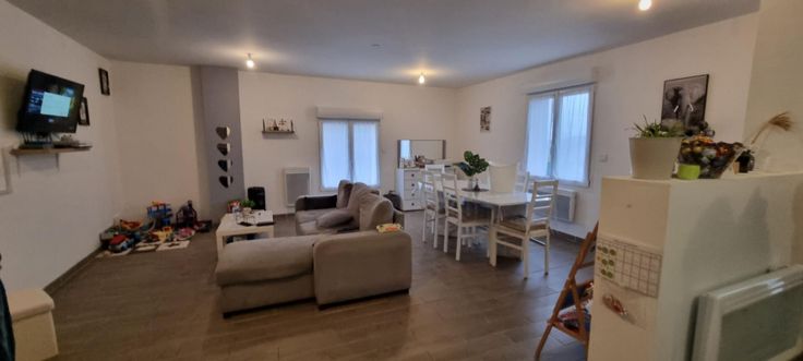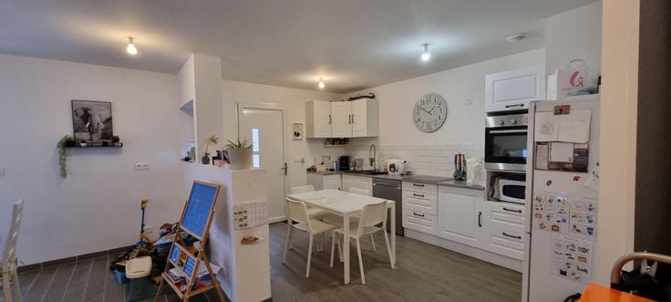 D'une grande pièce à vivre avec une cuisine équipée, 3 chambres, salle de bain, wc, garage pouvant accueillir plusieurs véhicules, jardin