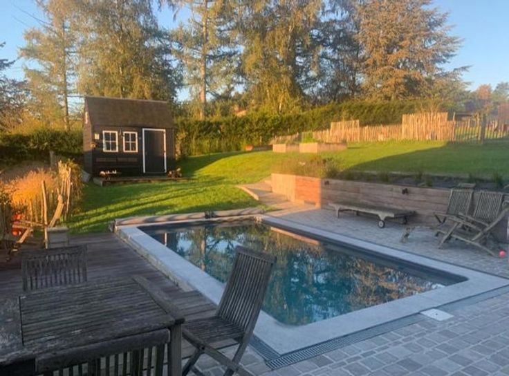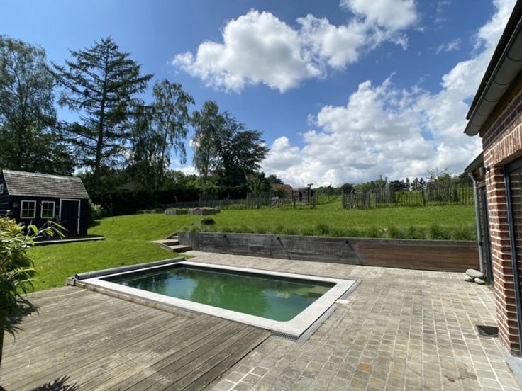 A l’extérieur : belle terrasse en pierre bleue, piscine, jardin joliment planté