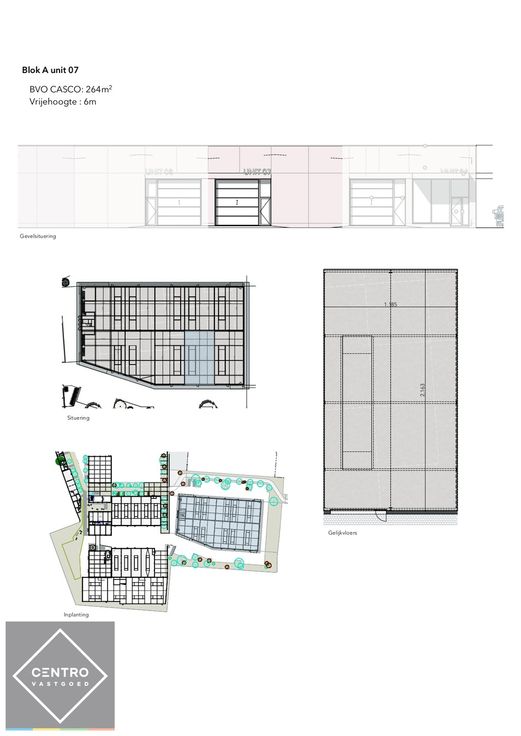 - Op de gevel is een plaats voorzien voor uniforme reclame van de verschillende bedrijven. Deze plaats is voor iedere loods uniform. De reclame op de gevel zal op kosten van de koper geplaatst worden.