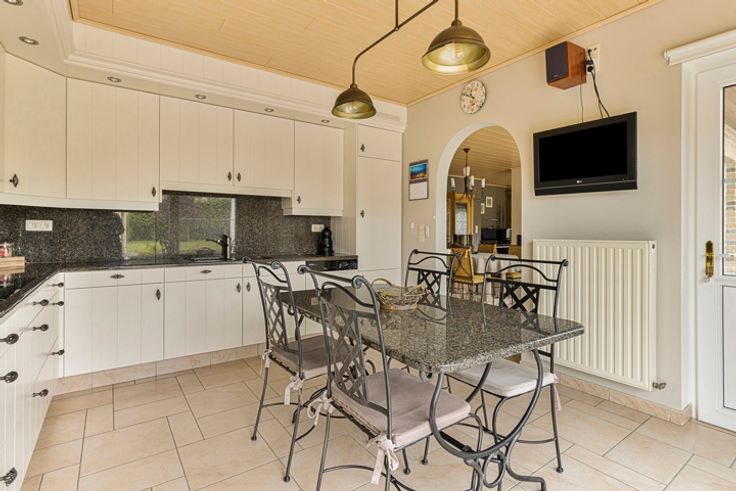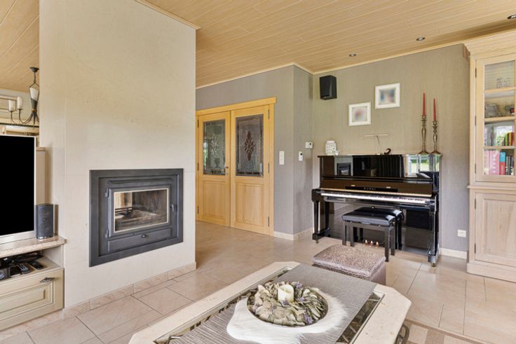 Je komt de woning meteen binnen in de inkomhal met gastentoilet, aansluitend heb je de lichtrijke leefruimte met haardvuur, een ruime keuken (inductievuur, dampkap, oven, combi, vaatwasser, dubbele spoelbak, frigo en diepvries), berging/wasplaats, dubbele garage, badkamer en 2 slaapkamers.