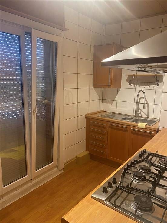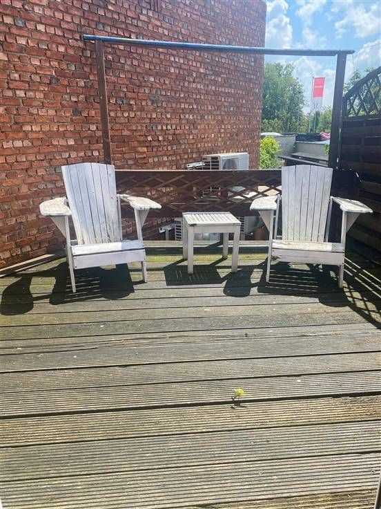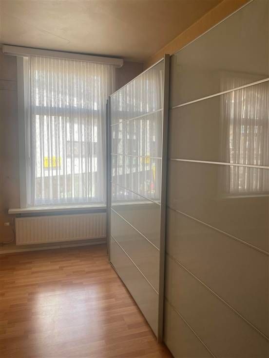 Op de eerste verdieping vindt je de woonst die bestaat uit een ingerichte keuken met dakterras, raam voorzien van rolluik. Badkamer met hoekbad en lavabo + meubel, 2 slaapkamers, berging.