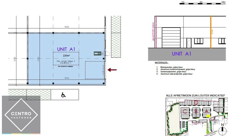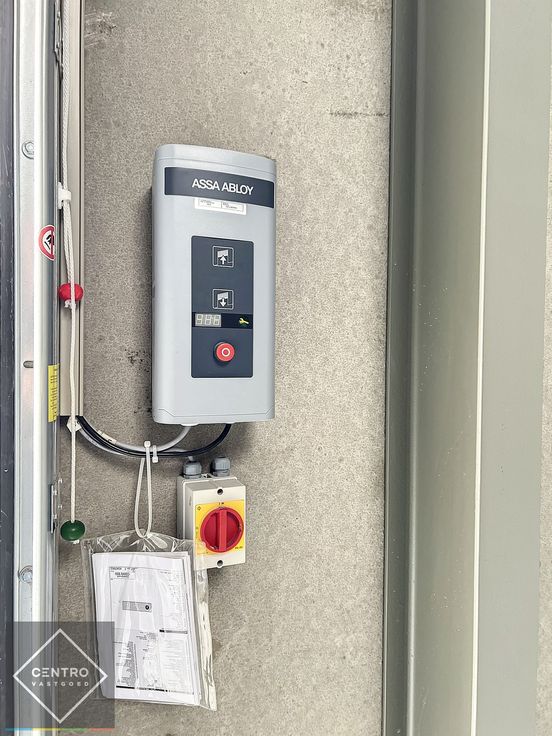 - 1 geïsoleerde, elektrische sectionaalpoort (h: 4,5m; b: 4m).