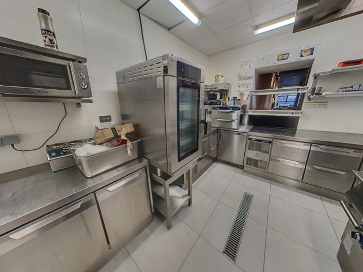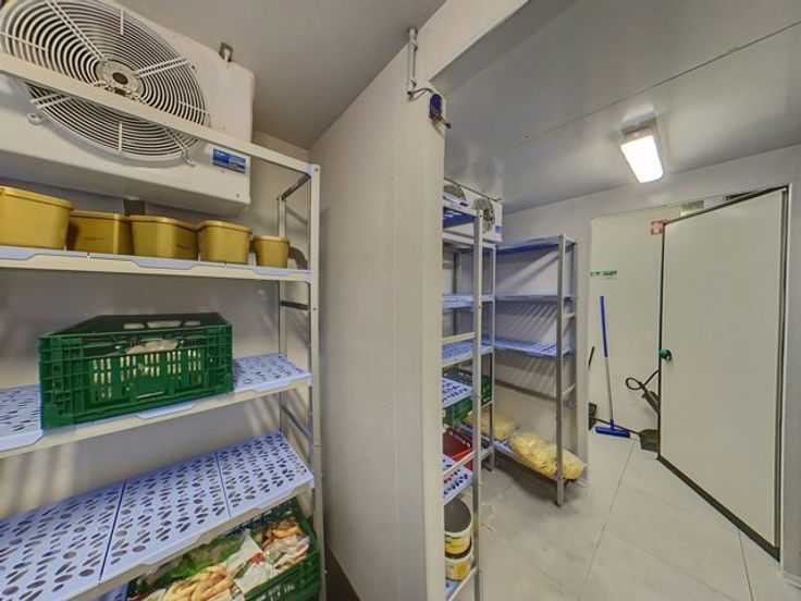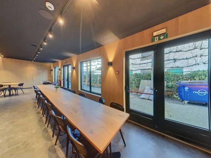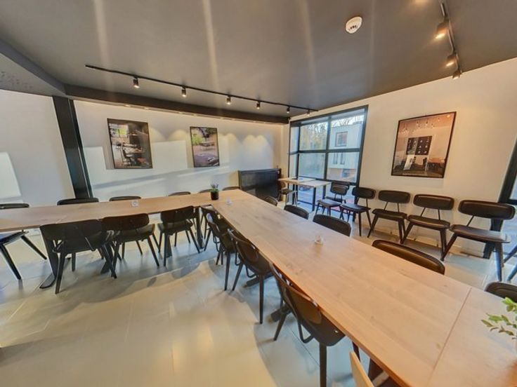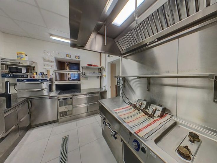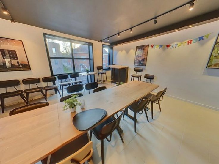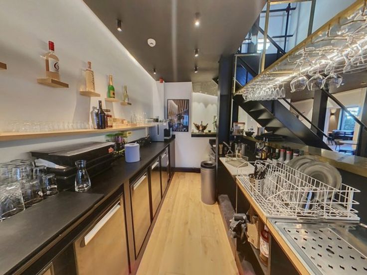 Dit gebouw beschikt op de gelijkvloerse verdieping over een verbruikersruimte met toog (123m²), een keuken (56m²), een (wijn)kelder, een sainitair gedeelte (M/V) en een veranda (51m²) die tevens toegang biedt tot het terras met de tuin.