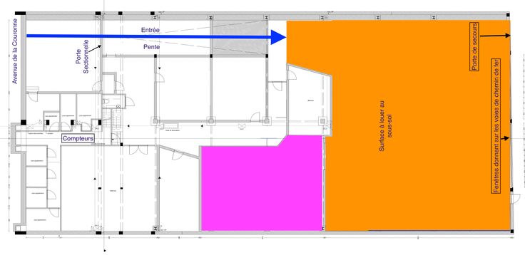 Surface de 349m2 (possibilité +95m2 moyennant augmentation du prix) se situant au sous-sol par rapport à l'avenue de la Couronne et au r-d-c par rapport au chemin de fer. Grandes baies vitrées en verre martelé (avec graffitis non désirés!). Sortie de secours. Accès via la porte sectionnelle électrique ou via la porte d'entrée des appartements (4 portes piétonnes à franchir dans ce cas). La surface pourra être entièrement privatisée. Accès à sanitaires communs. Compteurs individuels eau, gaz, électricité et possibilité fibre optique. Idéal pour entrepôt, ateliers, surface d'entraînement sportif, yoga, etc. (Pas de car wash, éventuellement stockage voitures mais pas de travaux mécaniques). Vente sur place de produits divers sous forme de dépôt/ vente éventuellement possible.