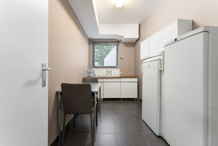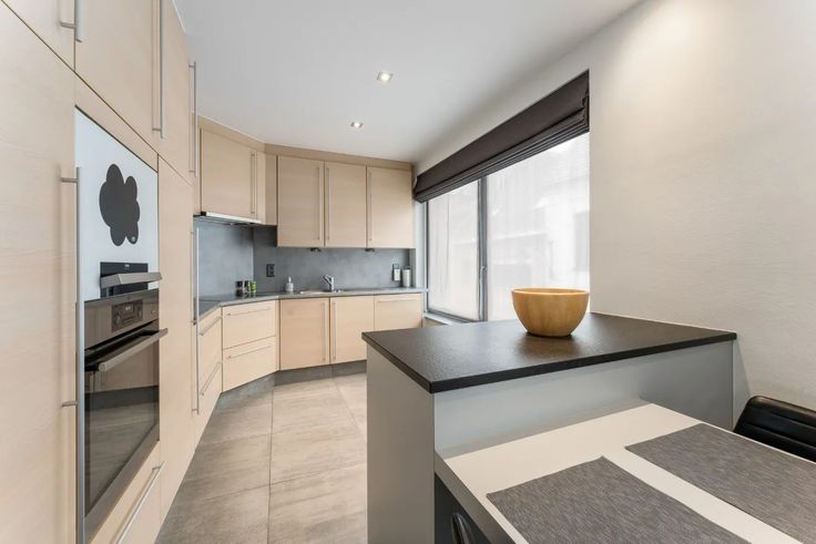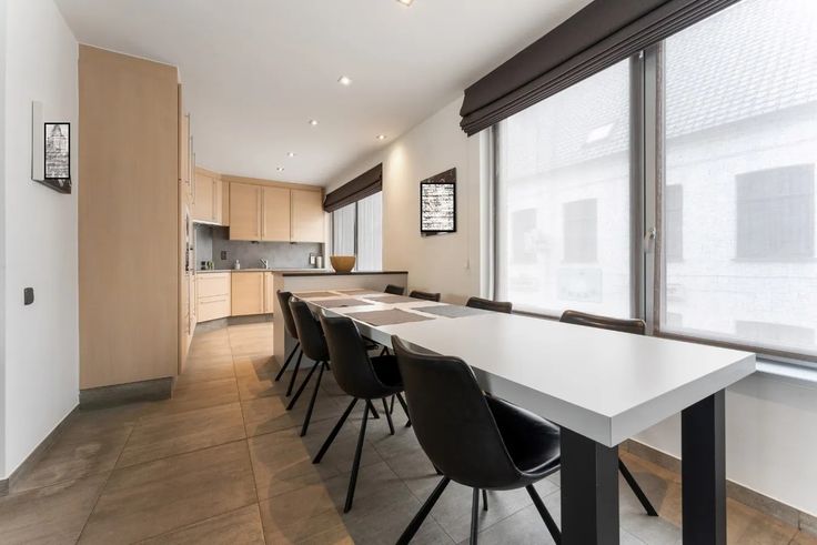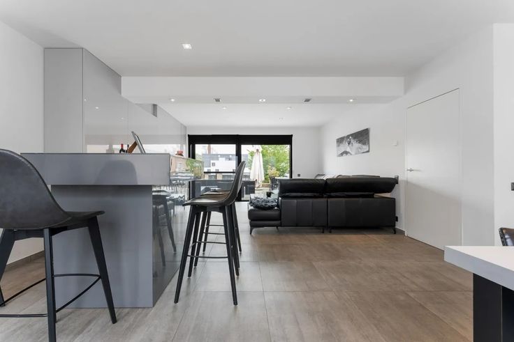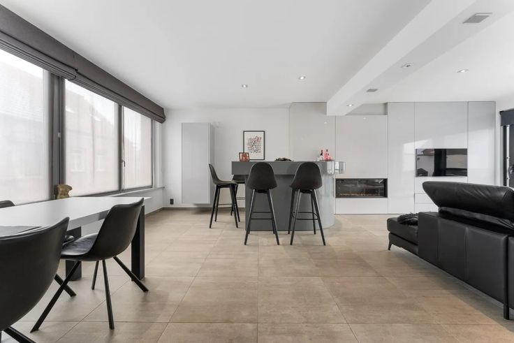 Via de trap, begeven we ons vervolgens naar de eerste verdieping, waar zich de vestiaire met toilet bevindt. Deze hall biedt rechtstreeks toegang tot de open leefruimte met geïnstalleerde keuken (kookplaat, dampkap, oven, vaatwas, koelkast + ingemaakte kasten).
