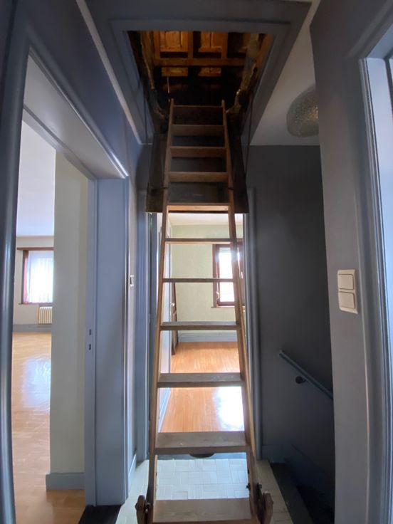 Op het 1ste verd.: overloop, 3 slpks (waarvan de master bedroom heel ruim is), badkamer met ligbad, wastafelmeubel en toilet. Via zoldertrap toegang tot een grote (geïsoleerde) zolderruimte die desgewenst verder ingericht kan worden.