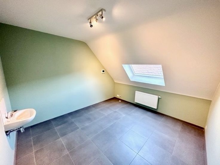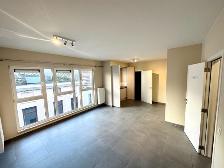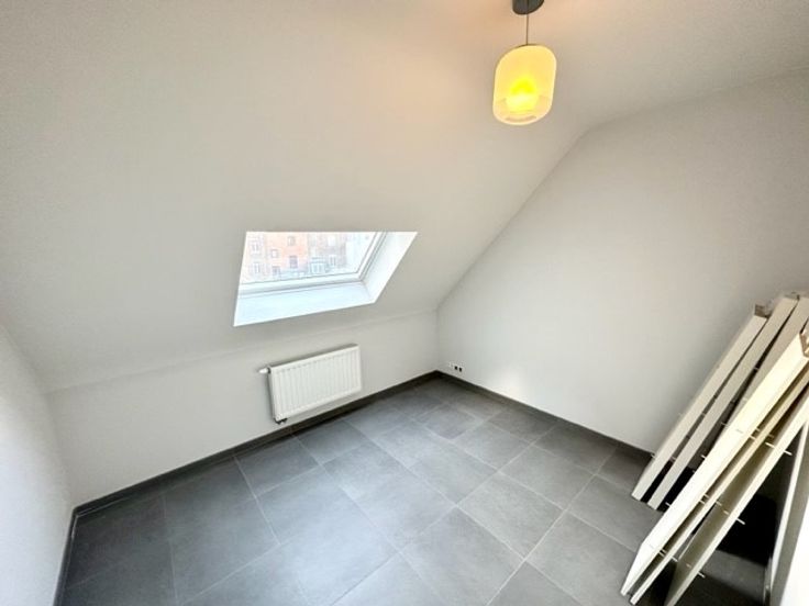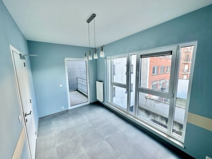 Hall d’entrée, wc, une pièce cuisine équipée USA avec salle à manger, un petit séjour donnant sur une terrasse, 2 chambres, une salle de bains, une cave, 2 emplacements de parking, PEB B & électricité conforme. Provisions de charges ± 250 €/mois.