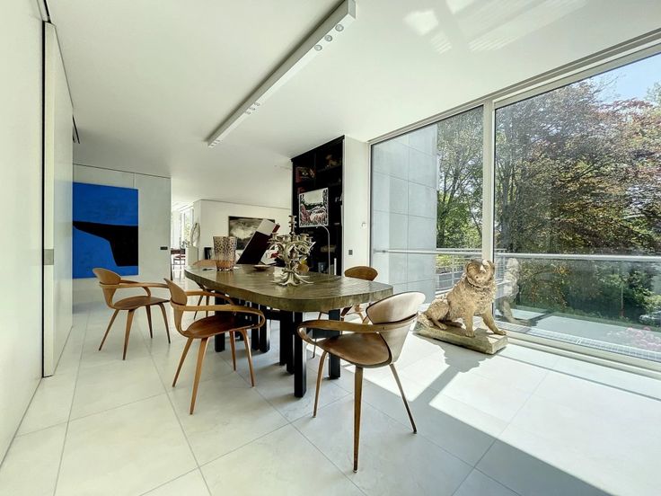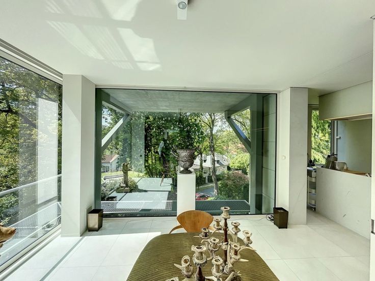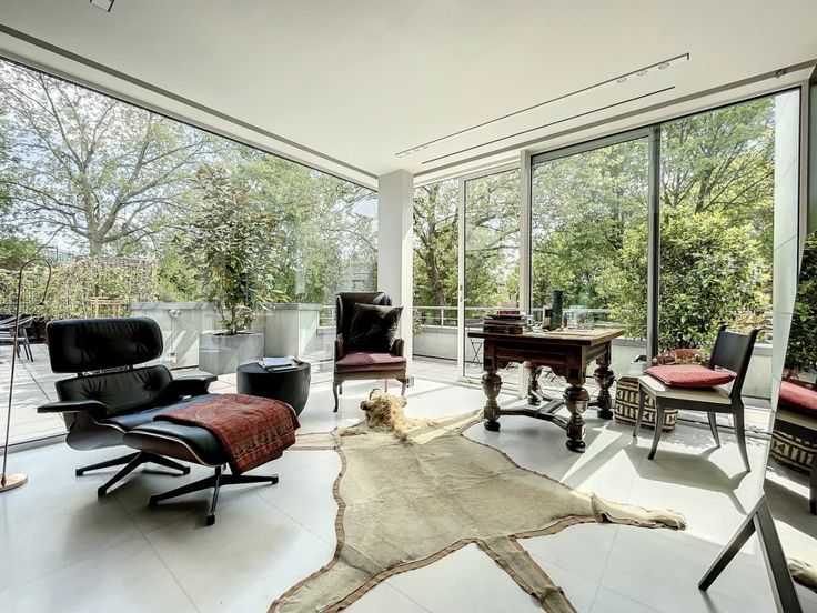 Bijzonder en zeer exclusief Penthouse met grote raampartijen en uitzicht op de bomen. In een klein condominium uit 1999 getekend Marc Corbiau, Barnes Brussels biedt te koop dit lumineus appartement van ongeveer 234m2 woonoppervlak (volgens EPC). Gelegen op de bovenste verdieping van de 3, is het als volgt samengesteld: eetkamer en woonkamer met toegang tot het 150m2 terras op het zuiden gericht en volledig rondom het appartement, aparte ingerichte keuken, hoofdslaapkamer met dressing en marmeren badkamer, kantoor of tweede slaapkamer en een wasruimte die ook als kamer omgebouwd kan worden. Een kelder maakt deel uit van de verkoop. Drie garageboxen in supplement. Hoge plafonds (2,90m), gepantserde deur, alarm, dubbele beglazin g, zonnescherm, PEB D- Zeer zeldzaam en AA+ ligging