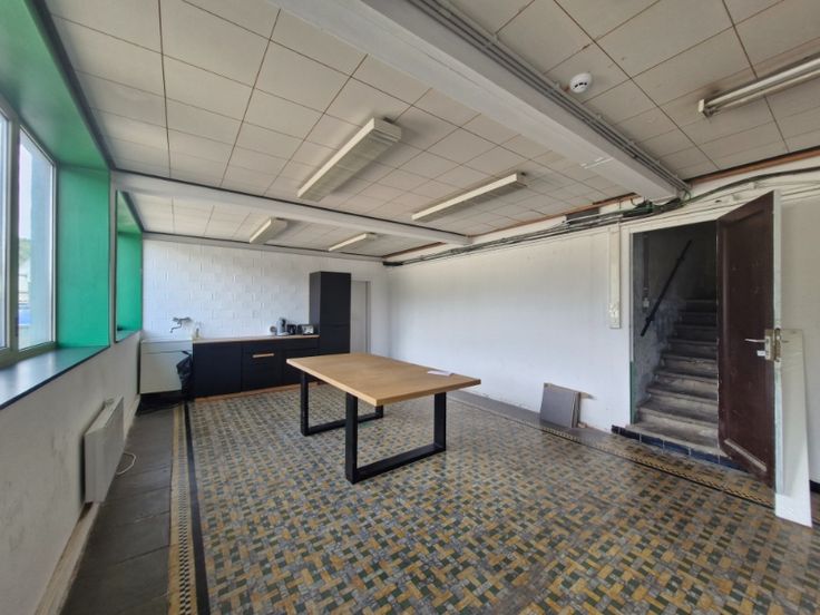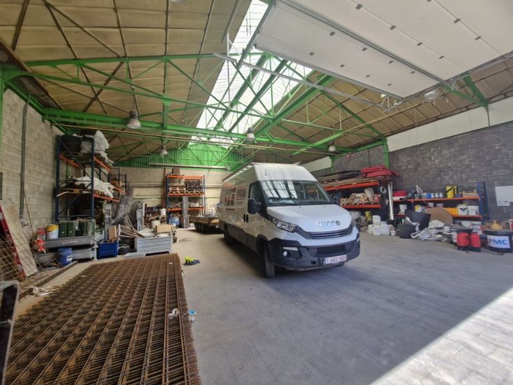 Opslagruimten van +/- 300 m² hoogte 5m, een grote elektrische sectionaaldeur + multifunctionele ruimte om te delen (toilet, kitchenette en kantoor), zeer goed gelegen nabij snelwegen op Manage