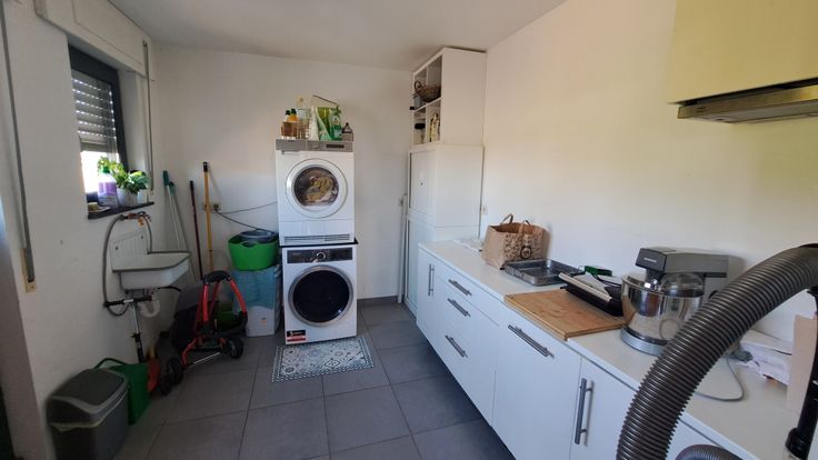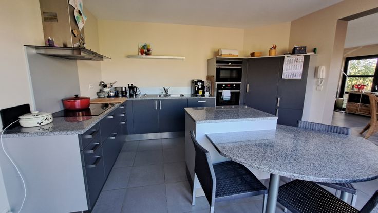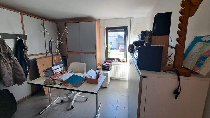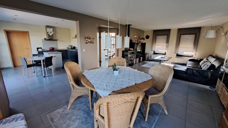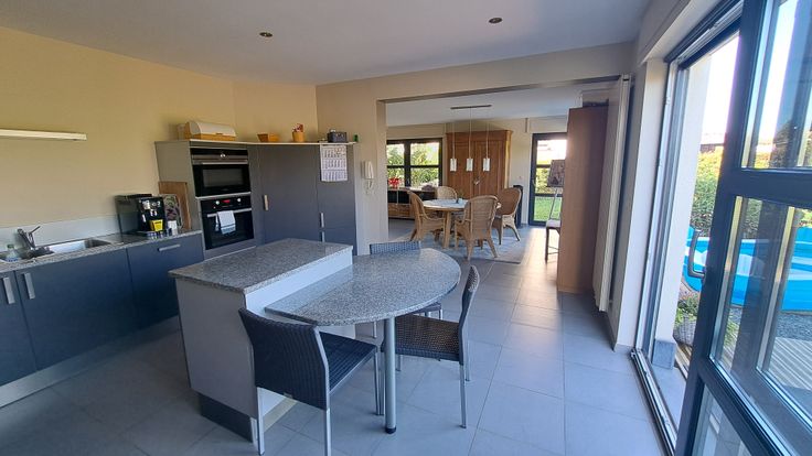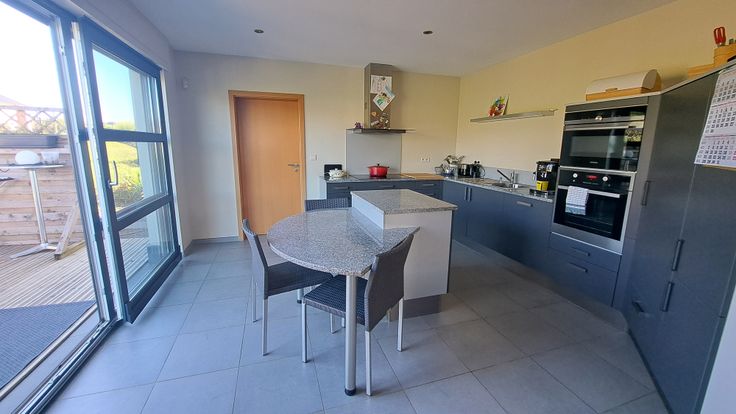Composition : hall, bureau, WC, grand séjour agréable (living et salle à manger), cuisine équipée (électro Kuppersbusch) avec coin à manger. Vaste buanderie permettant un accès direct à la terrasse.