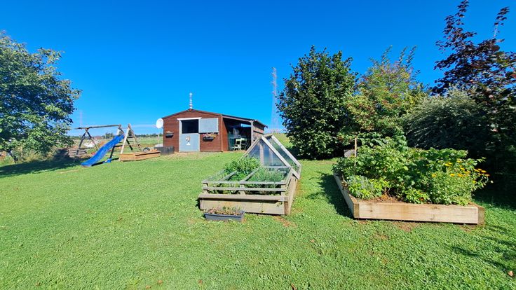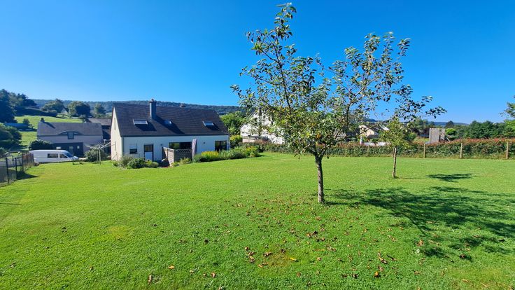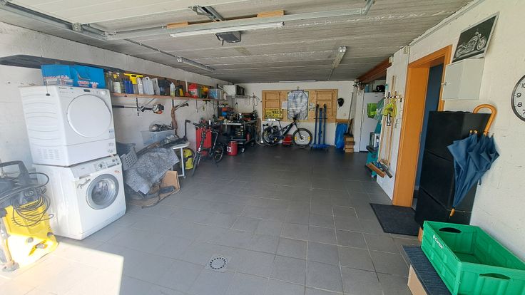 Vaste garage pour 2 voitures (portes télécommandées), cave. Grand jardin (13 ares) avec remise.