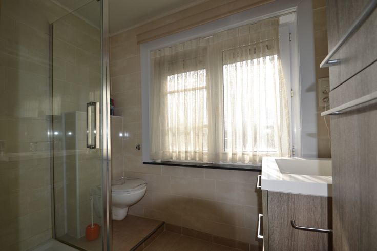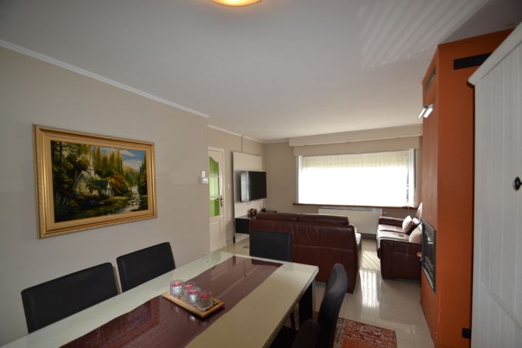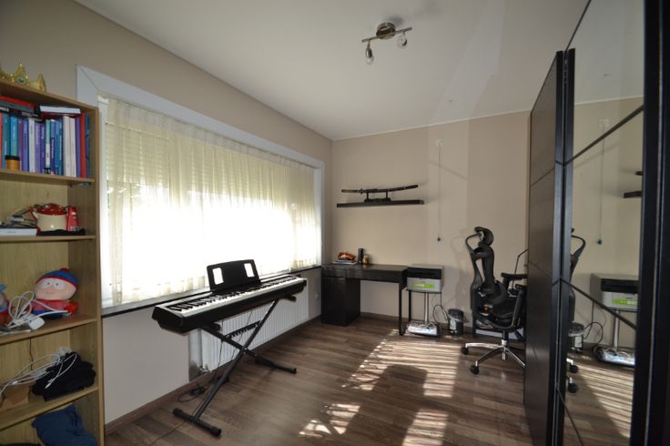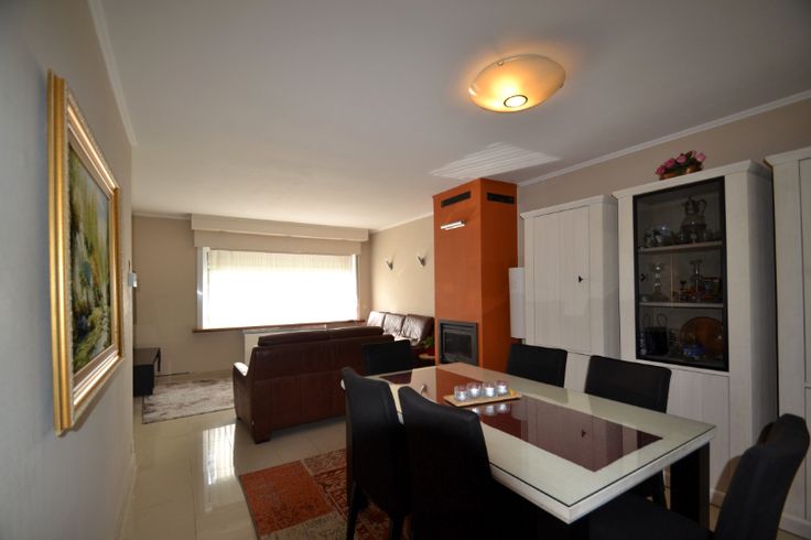 Via de inkomhal (met bezoekerstoilet en toegang naar de droge kelder)) komen we in de leefruimte, bestaande uit het salon (met houtcassette) en de eetplaats. Aansluitend is er en volledig uitgeruste keuken (vaatwasser, gasfornuis, dampkap, stoomoven, microgolfoven en Amerikaanse koelkast). Rechts van de woning is er de garage (met aansluiting wasmachine op regenwater), voorzien van een elektrisch bediende sectionaalpoort (met afstandsbediening en cijferklavier) . Via de veranda hebben we toegang tot de tuin (met tuinhuis). Boven zijn er de badkamer (2de toilet, douche en badkamermeubel met wastafel) en 3 ruime slaapkamers, allen met CV, laminaatvloeren en PVC-ramen met dubbel glas en elektrische rolluiken.