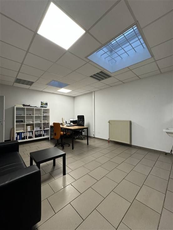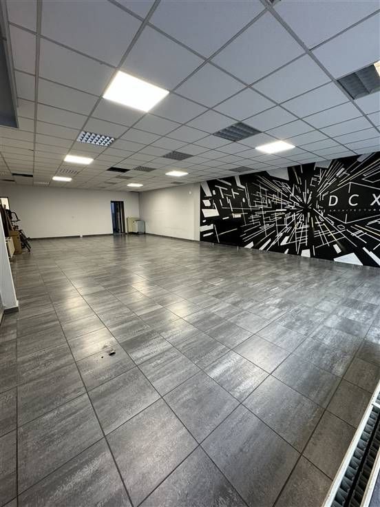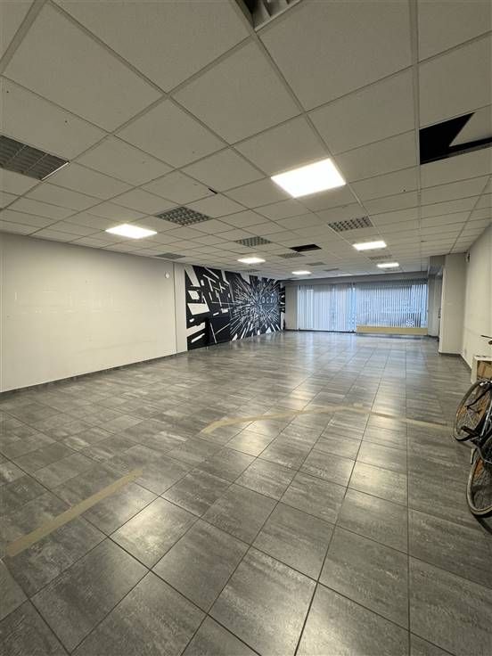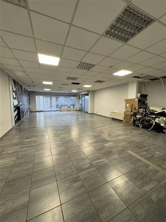 Bij het binnenkomen is er een zeer ruime polyvalente handelsruimte(ca. 89m2). Dewelke momenteel is ingedeeld met wachtruimte en kantoor/werkplek .