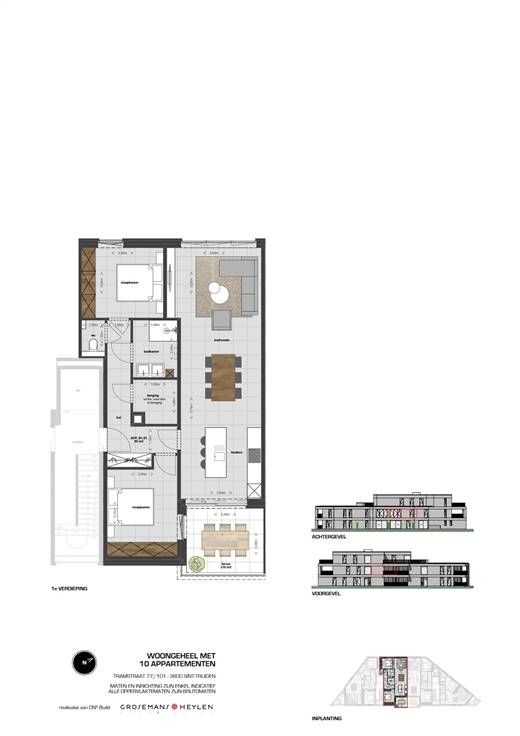 Wonen met al het nodige comfort op een boogscheut van het centrum van Sint-Truiden.. dat kan in residentie ‘Tram 75-77'! Dit project bestaat uit 10 appartementen. Het merendeel van de appartementen zijn ‘doorzonappartementen’ en zijn voorzien van één, twee of drie slaapkamers. Elk appartement heeft een terras aan de leefruimte. De gemeenschappelijke buitenzones worden aangelegd met groen en kwalitatieve materialen. Naast de ideale ligging werd er ook gedacht aan het ecologisch aspect en is er oog voor detail. Indeling appartement 77/101: Inkomhal met toegang de 2 ruime slaapkamers, ruime badkamer, apart toilet en berging. Leefruimte met open keuken voorzien van een terras aan de voorzijde zuid-oost georiënteerd waardoor voldoende daglicht gegarandeerd wordt. Mogelijkheid tot aankoop van een autostaanplaats in de ondergrondse verdieping en/of kelderberging. TROEVEN: ·Rustige locatie maar met een zeer goede bereikbaarheid ·Moderne architectuur met kwalitatieve afwerking ·Ruime afwerkingsbudgetten ·Alle modern comfort ·Vrijstelling onroerende voorheffing NU TIJDELIJK TE KOOP AAN 6% IPV 21% indien u aan de voorwaarden voldoet. Let op: enkel nog geldig t.e.m. 31/12/2024!