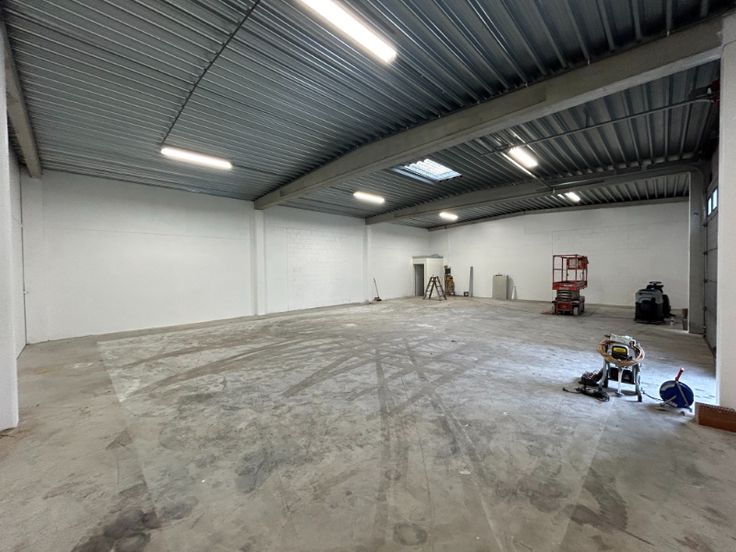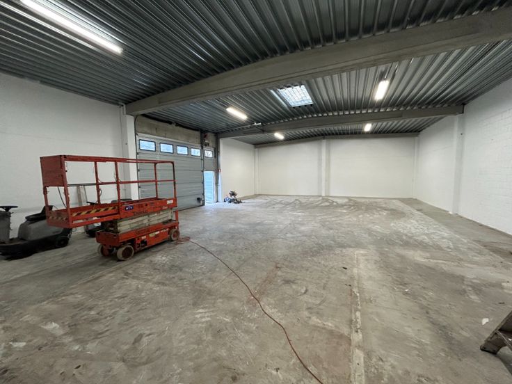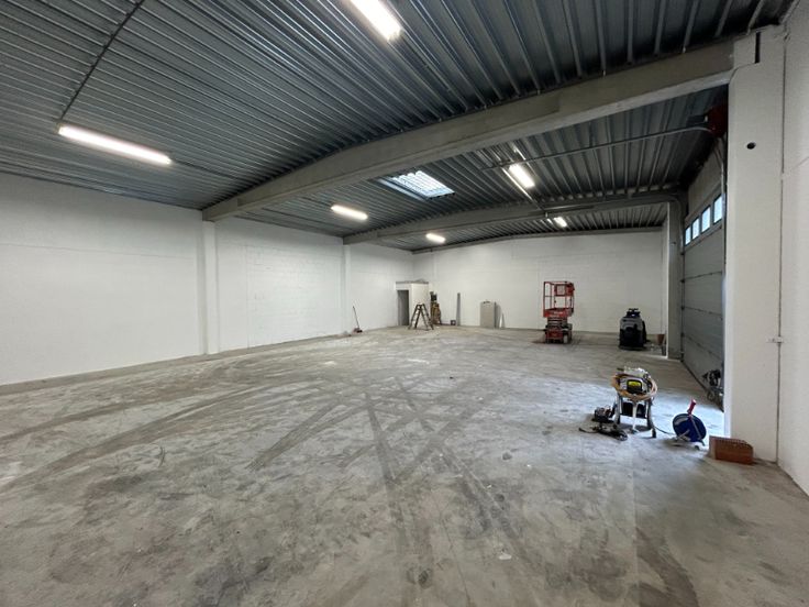 De loods is gebouwd met een stevige betonstructuur en betonnen wanden en is uitgerust met een polybetonvloer, automatische sectionale poort, verlichting en een toilet. De minimum vrije hoogte van 5,8 meter en het geïsoleerde steeldeck maken dit magazijn veelzijdig en energiezuinig.