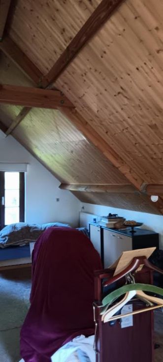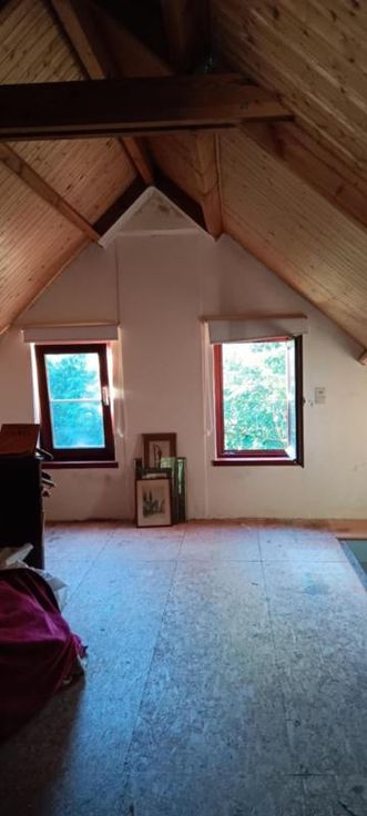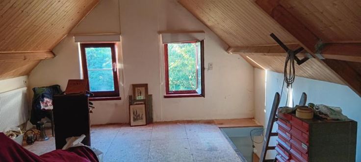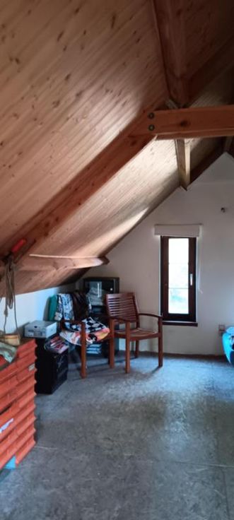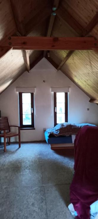Te renoveren hoeve op uitgestrekt perceel grond. Bestaat uit: - Bijgebouw (hier bevinden zich de voorzieningen water/gas/elektr) - Woning: a) Op gelijkvloers: badkamer met ligbad/WC/lavabo Living/keuken met kachel b) Op de 1ste verdieping: open zolderkamer Woning heeft dubbele beglazing. Dak van het bijgebouw ongeveer 2 jaar geleden vernieuwd; dak van het huis ongeveer 10 jaar oud. ZONEVREEMD gelegen: het is enkel mogelijk om verbouwingswerken uit te voeren binnen het bestaande bouwvolume.