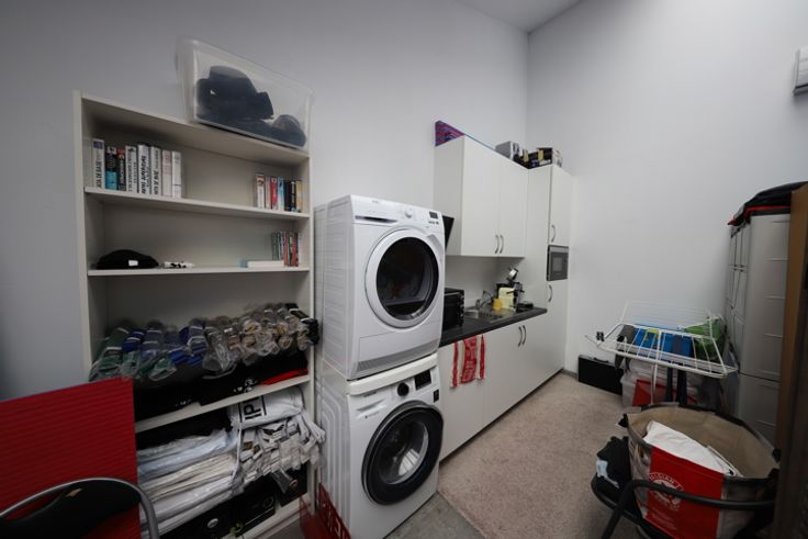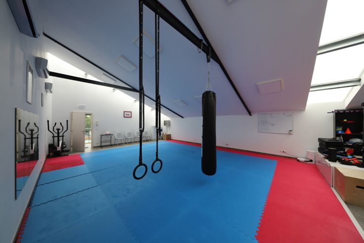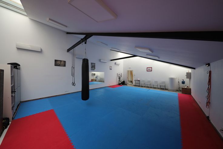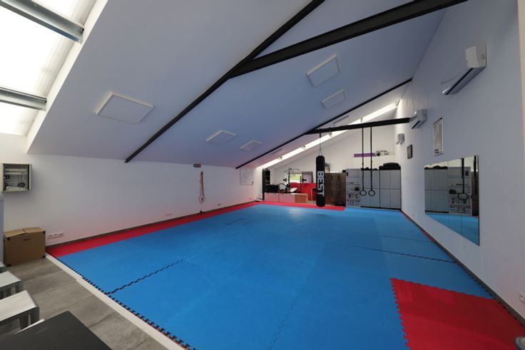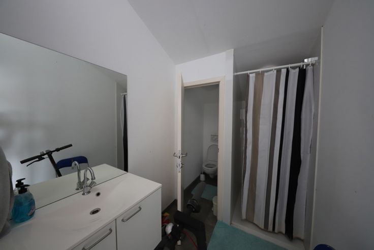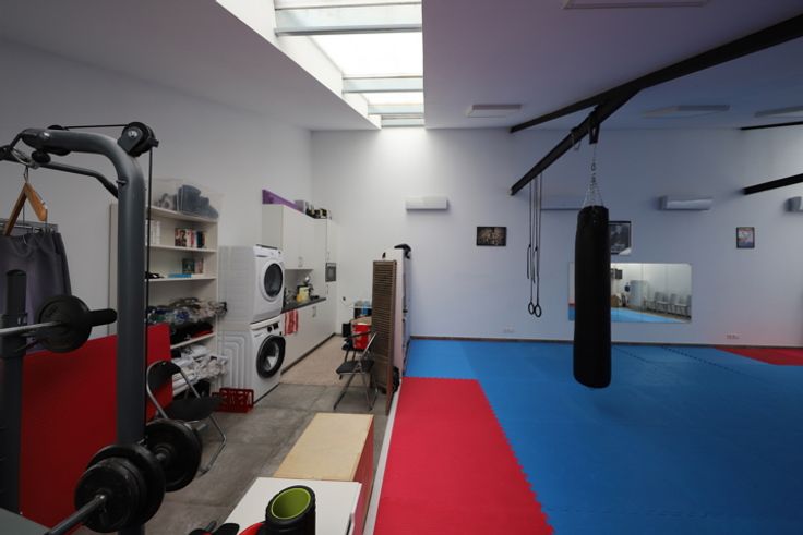 Ruimte op eerste verdieping met trap, momenteel sportzaal. Trap naar hal, toilet en aparte douche, open ruimte. Je kan buiten parkeren met meerdere wagens. Airco.