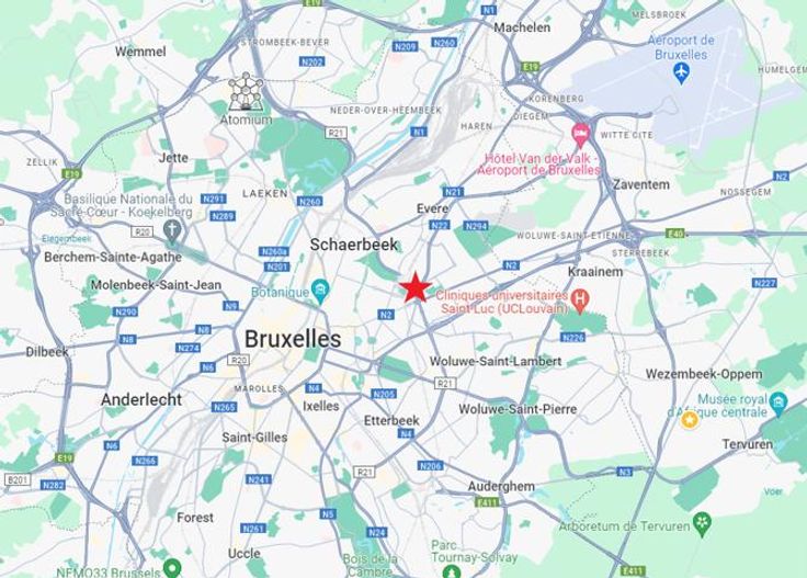 Transports en commun à proximité du bâtiment : tram, métro, bus De Lijn/STIB, gare SNCB.
