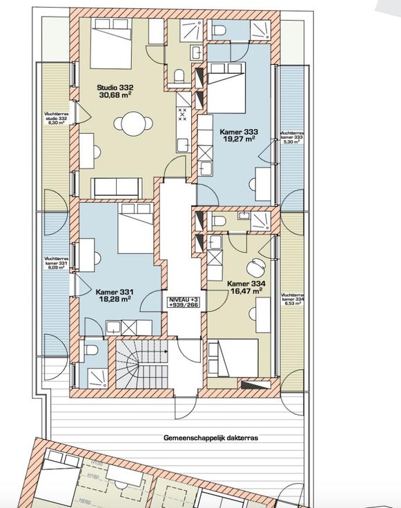 Het gebouw telt 3 vleugels en beschikt over een grote binnenkoer. Op het 3e verdiep heb je ook toegang tot een aangenaam gemeenschappelijk dakterras. Het gebouw zal eind 2023 klaar zijn voor oplevering, waardoor het de perfecte plek is voor elke student die op zoek is naar comfort en stijl.