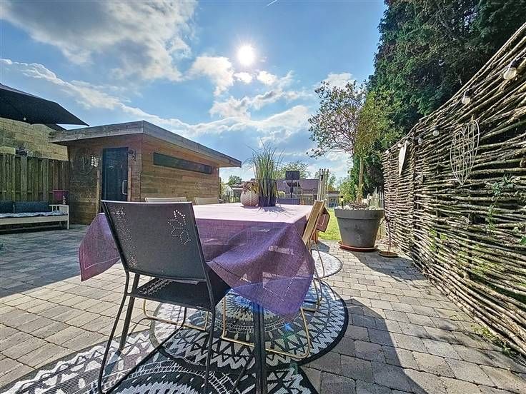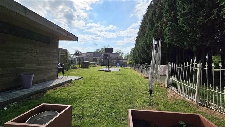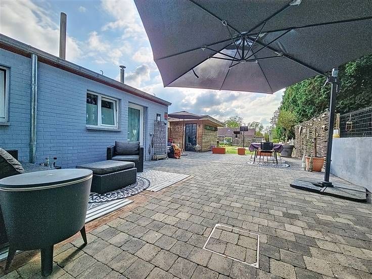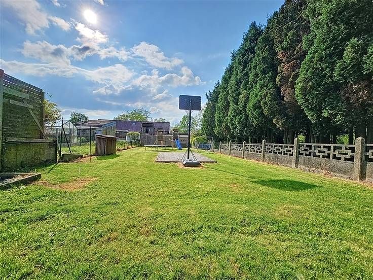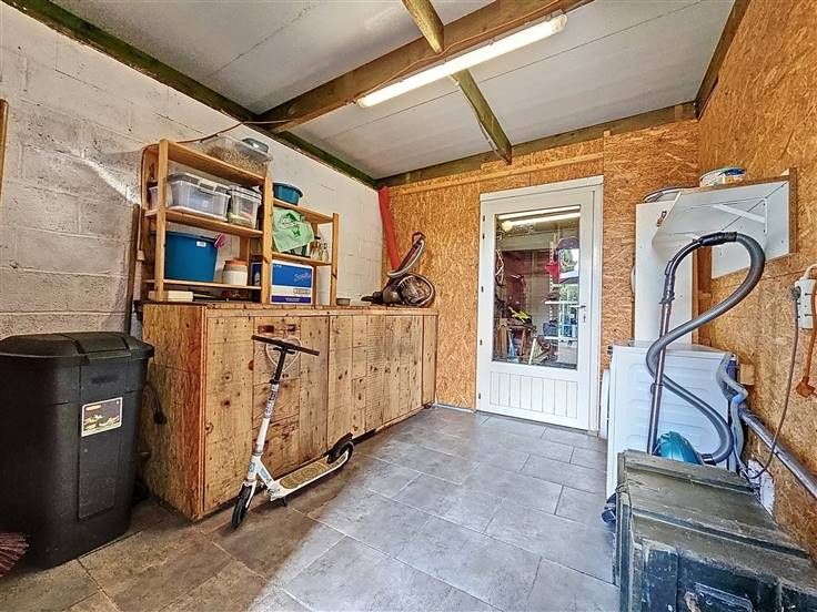 Rez: Hall d'entrée, living, cuisine équipée sauf frigo, WC séparé, salle de douche, buanderie, garage, parkings sur l'avant, terrasse, chalet, jardin.