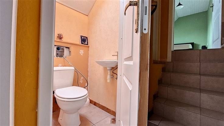 Rez: Hall d'entrée, salon, salle à manger, cuisine équipée, véranda, WC séparé, débarras (pouvant devenir une buanderie), cour, emplacement de parking, garage et jardin.