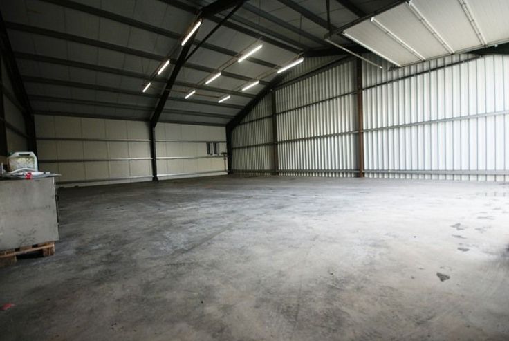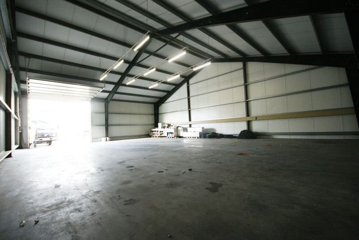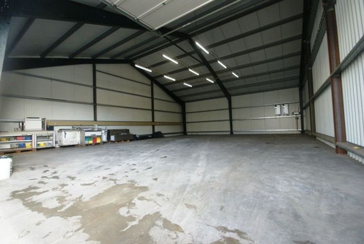 AFWERKING: Metalen constructie, gepolierde betonvloer, geïsoleerd zadeldak, TL-verlichting, vrije hoogte: 4,5m, 1 manuele sectionaalpoort (h: 4m).