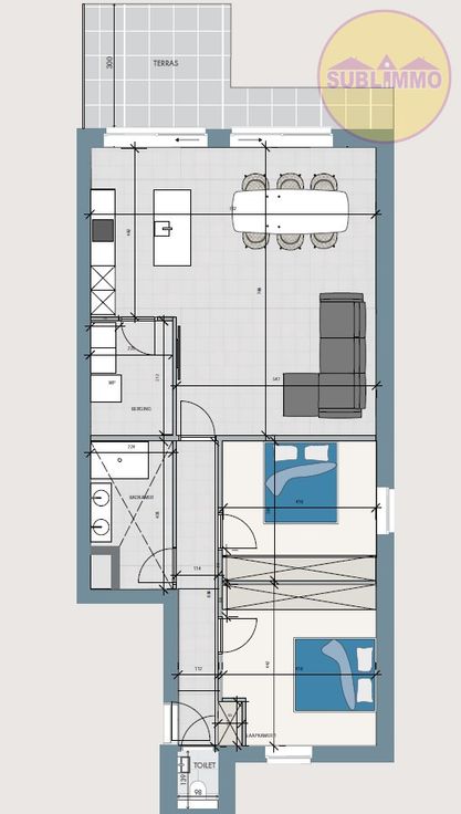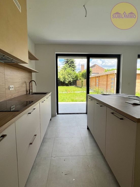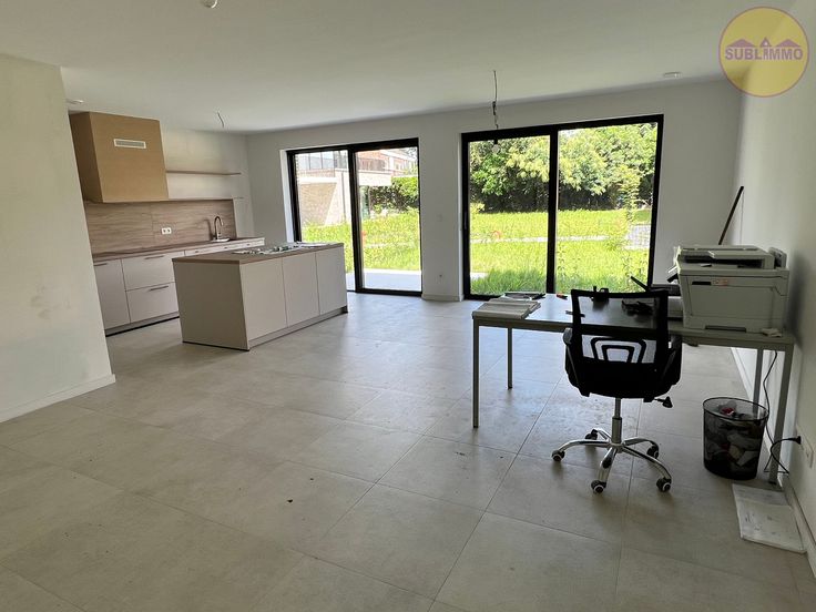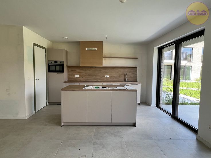 Dit nieuwbouwappartement op het gelijkvloers (107,40 m²) omvat 2 slaapkamers, een badkamer met inloopdouche en wastafel met 2 lavabo’s, een apart toilet, een berging/wasplaats en een leefruimte met open keuken. De keuken is volledig geïnstalleerd en biedt een prachtig uitzicht op het terras met tuin en de gemeenschappelijke binnentuin. Verder heeft het gebouw een gemeenschappelijke fietsenberging en is er een lift aanwezig.