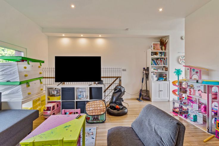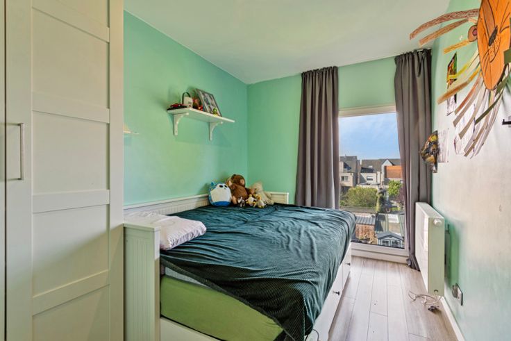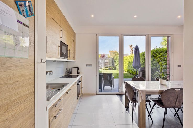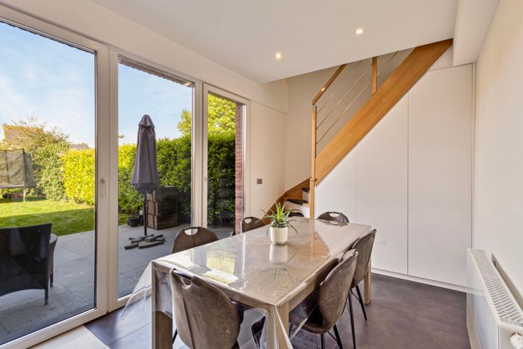 Moderne woning met tuin, garage en oprit in een rustige, residentiële wijk. Indeling: Bij binnenkomst op het gelijkvloers treft u een praktische inkomhal met gastentoilet aan, gevolgd door de volledig uitgeruste keuken met eetplaats. De eetplaats biedt een prachtig uitzicht op de tuin dankzij de grote raampartijen. De open keuken is voorzien van een oven, microgolfoven, koelkast, diepvriezer, vaatwasser, inox spoelbak en voldoende kastruimte. Daarnaast is er een handige ingemaakte kast onder de trap. De ruime garage bevindt zich aan de voorzijde van de woning, samen met de oprit. Alle nodige technische installaties zijn voorzien in de garage, zoals de ketel, omvormer voor de zonnepanelen en het ventilatiesysteem. De tuin van 120m² is zuidgericht en is voorzien van een tuinhuis. Op de eerste verdieping is momenteel een ruime leefruimte en speelkamer ingericht, met in het midden de trap naar de tweede verdieping. Deze ruimte kan ook perfect dienen als één grote leefruimte. De tweede verdieping beschikt over een grote slaapkamer met een kleine dressing, die eventueel omgebouwd kan worden tot tweede badkamer. De aansluitingen hiervoor zijn reeds voorzien. Verder zijn er nog twee slaapkamers van elk 9m². De badkamer is uitgerust met een ligbad (voorzien van regendouche), toilet en wastafel met meubel. Bijzonderheden: Uitgerust met zonnepanelen; Uitbouwen mogelijk; Bouwjaar: 2019; Gunstig E-peil; Oprit en garage; Ruime tuin. Ligging: Deze woning is gelegen in een rustige eenr
