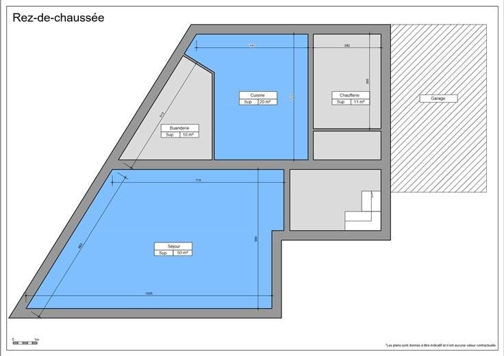 Rez: Hall d'entrée, WC séparé, grand living, cuisine équipée, cellier, buanderie, garage servant aussi de passage latéral carrossable, terrasse, jardin.