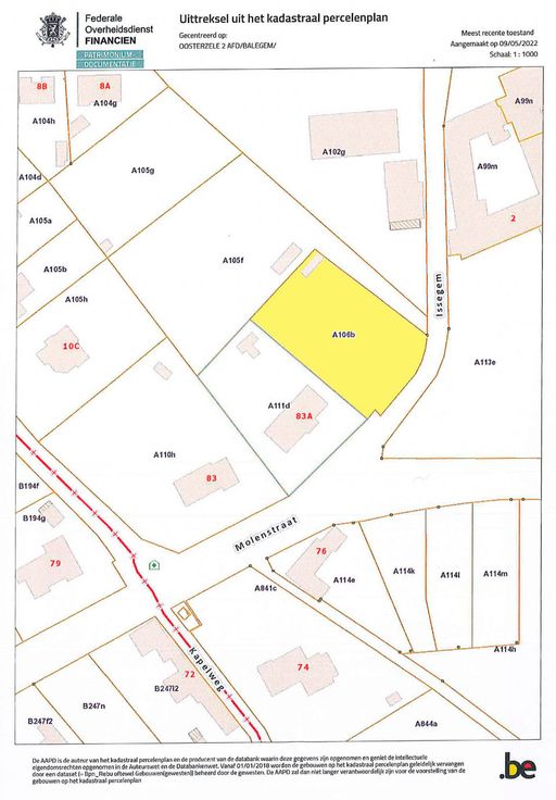35 meter straatbreedte. Mogelijkheid van 2 open bebouwingen of één grote woning. Zijstraat van de Molenstraat in Balegem Zeer goed bereikbaar en toch midden in de natuur. Dicht bij E40.