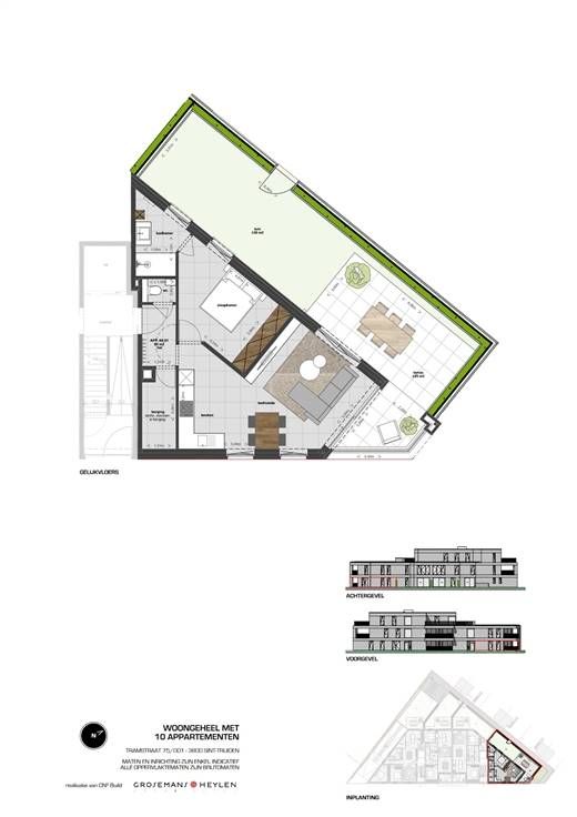 Wonen met al het nodige comfort op een boogscheut van het centrum van Sint-Truiden.. dat kan in residentie ‘Tram 75-77'! Dit project bestaat uit 10 appartementen. Het merendeel van de appartementen zijn ‘doorzonappartementen’ en zijn voorzien van één, twee of drie slaapkamers. Elk appartement heeft een terras aan de leefruimte. De gemeenschappelijke buitenzones worden aangelegd met groen en kwalitatieve materialen. Naast de ideale ligging werd er ook gedacht aan het ecologisch aspect en is er oog voor detail. Indeling appartement 75/001: Inkomhal met apart toilet en toegang tot berging, leefruimte met open keuken en aansluitend ruim terras van 25m², slaapkamer met aansluitend badkamer. Leuk tuintje van 39m² met aparte toegang. Mogelijkheid tot aankoop van een autostaanplaats in de ondergrondse verdieping en/of kelderberging. TROEVEN: ·Rustige locatie maar met een zeer goede bereikbaarheid ·Moderne architectuur met kwalitatieve afwerking ·Ruime afwerkingsbudgetten ·Alle modern comfort ·Vrijstelling onroerende voorheffing NU TIJDELIJK TE KOOP AAN 6% IPV 21% indien u aan de voorwaarden voldoet. Let op: enkel nog geldig t.e.m. 31/12/2024!