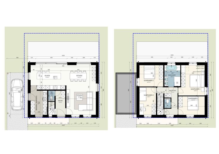 Variante 1 is de landelijke woning met een grote leefruimte met open keuken en zicht naar voor en achteraan. Op de benedenverdieping is ook een ruime berging voorzien en carport naast de woning.