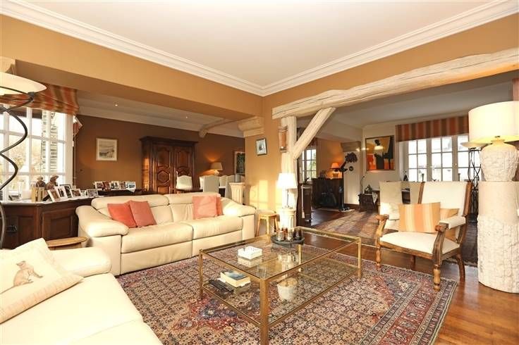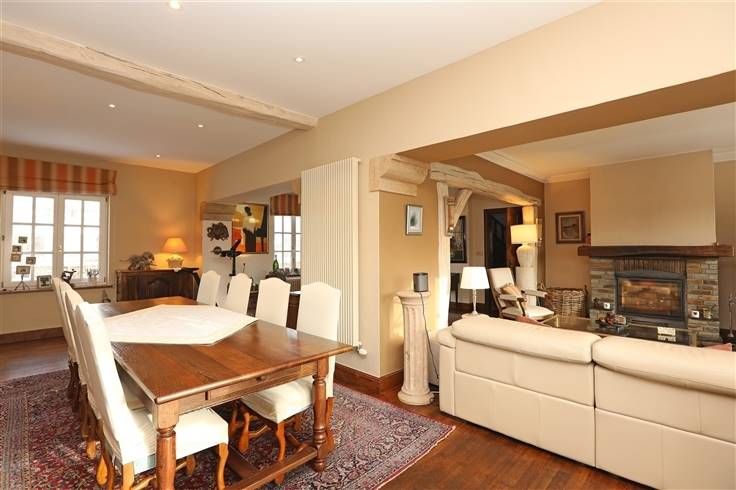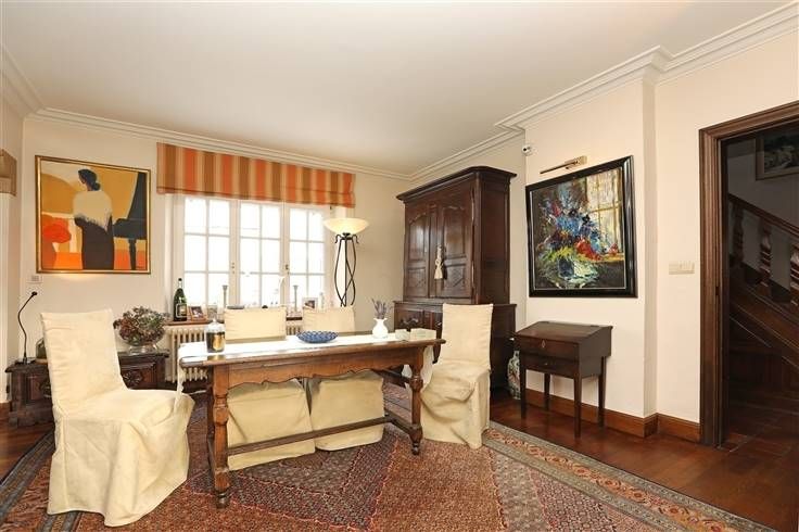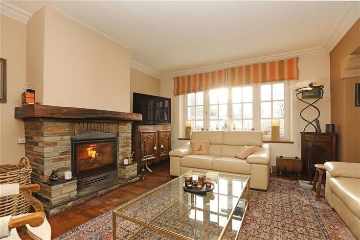 Inkomhal 13 m², grote lichte leefruimte 70 m² met salon en eetkamer, ingerichte keuken 23 m², bureel 12 m² en wc.