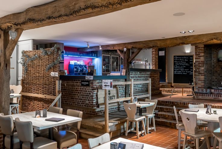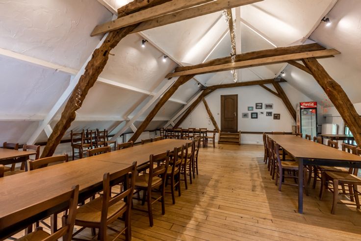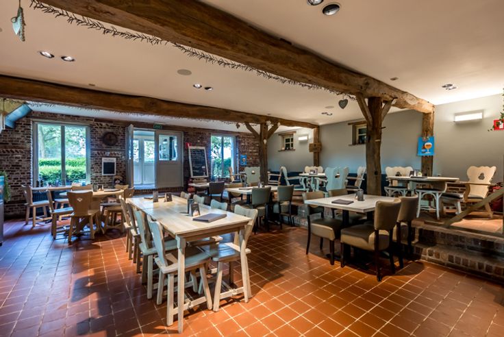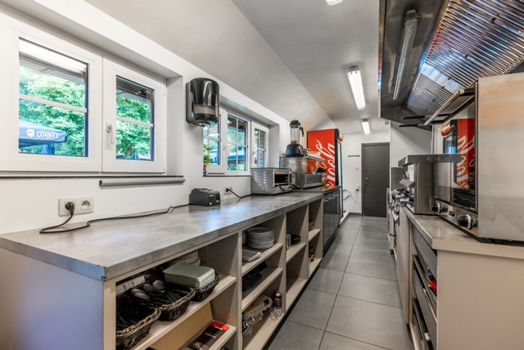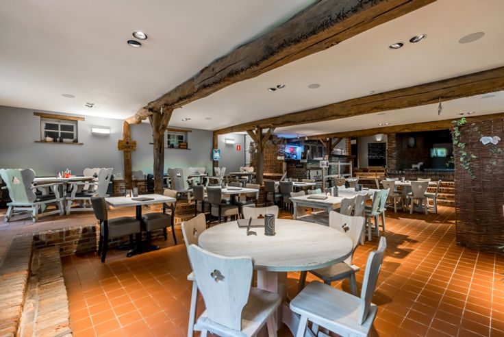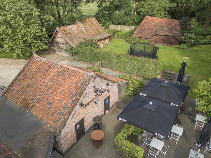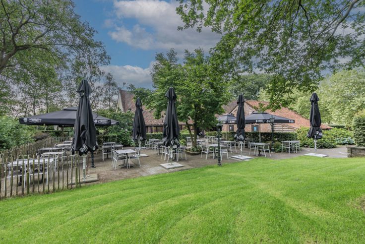Het hoofdgebouw bestaat momenteel uit een horecagedeelte met op de verdieping een polyvalente ruimte. Anderzijds is er een woonst aanwezig met een zithoek, leefruimte, 4 slaapkamers en een badkamer. Sanitaire voorziening is voorzien voor dames en heren. Er is een dubbele garage aanwezig dewelke ook functioneel kan zijn als opslag- en/of werkruimte.