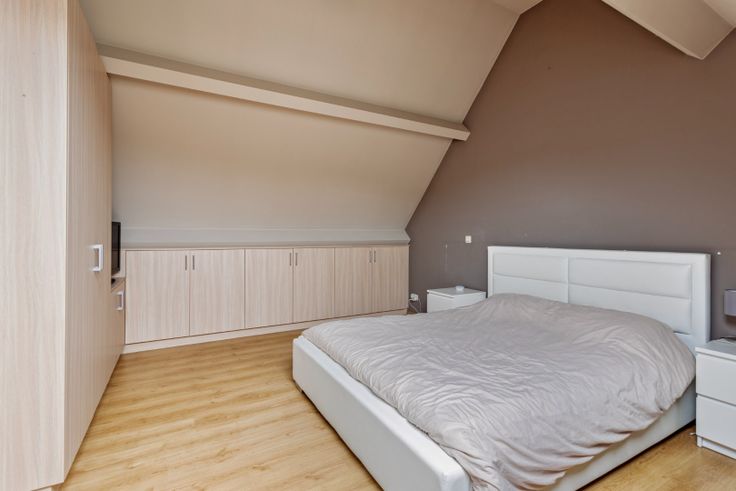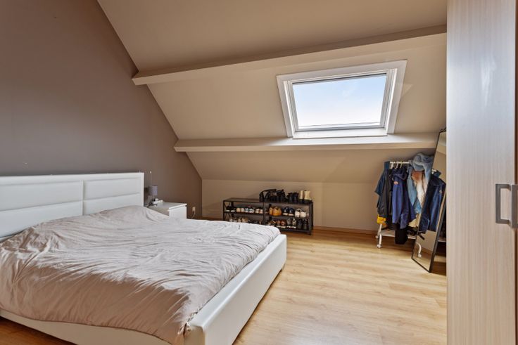 Op de verdieping bevindt zich de masterbedroom met plafond open tot in de nok. Dankzij de inbouwkasten geniet u hier ook extra opbergruimte. Recentelijk werd er een nieuw Velux raam gestoken.