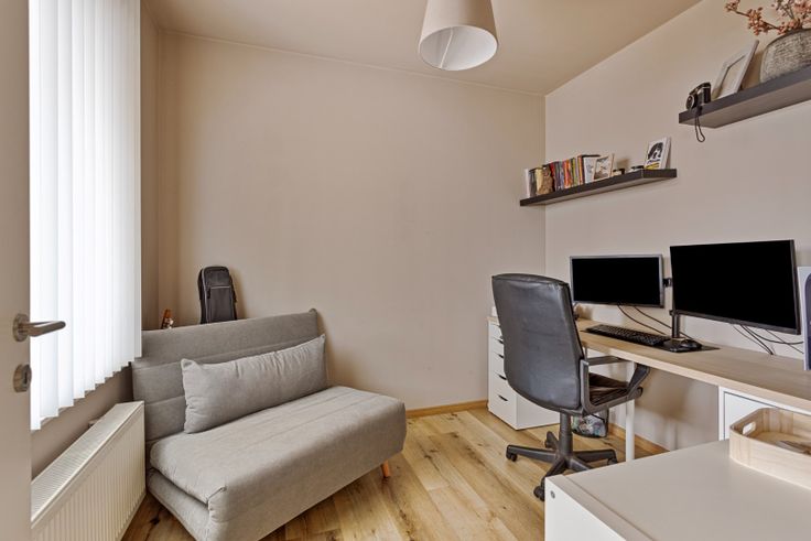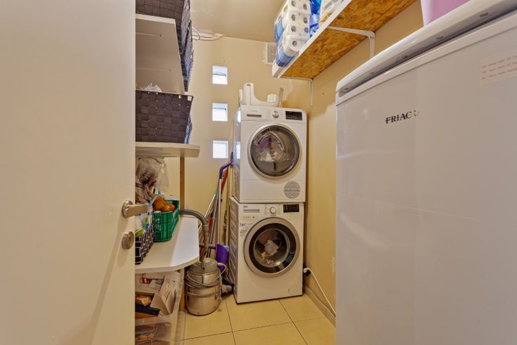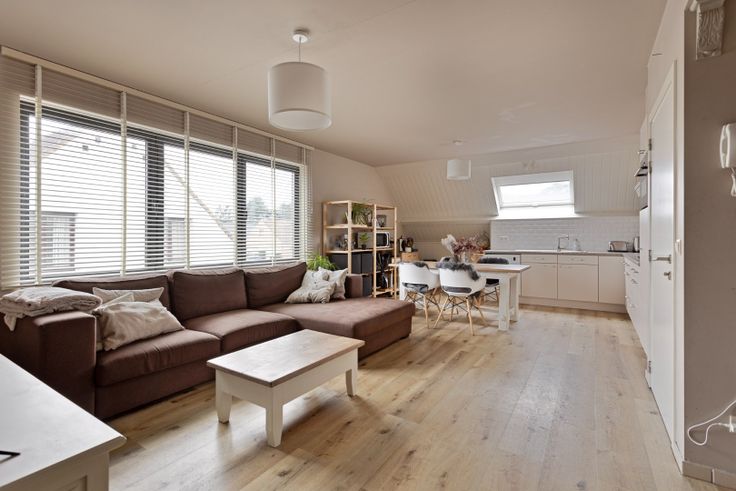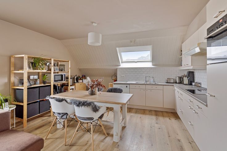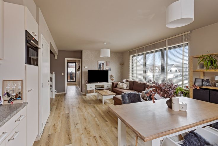 Via de gemeenschappelijke inkomhal, kom je in de leefruimte welke opgedeeld is in een zithoek, een eethoek en een open keuken. Dankzij de vele ramen geniet je hier aangenaam veel lichtinval en ruimtegevoel. De keuken is voorzien van een koelkast, heteluchtoven, keramische kookplaat, afsuigkap, vaatwasser, dubbele wastafel en voldoende kastruimte. Onder de trap naar boven is er nog een ruimte om bv een bureau te installeren.