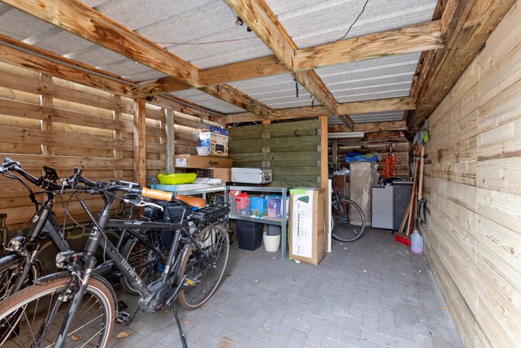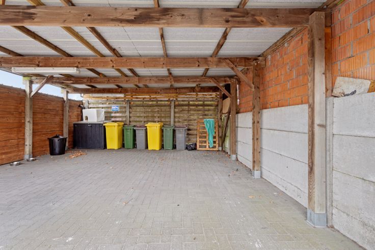 Achteraan het perceel is er een bergplaats en een carport. Een extra parkeerplaats is voorzien voor het gebouw.