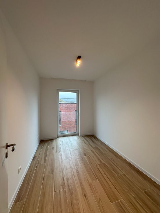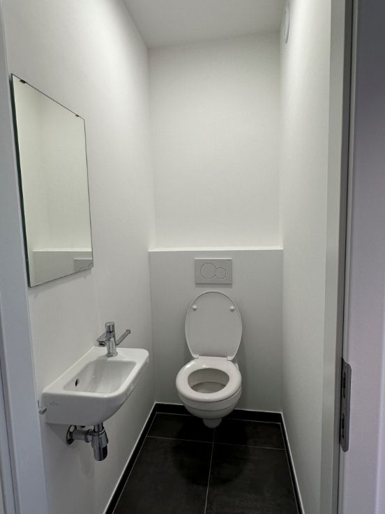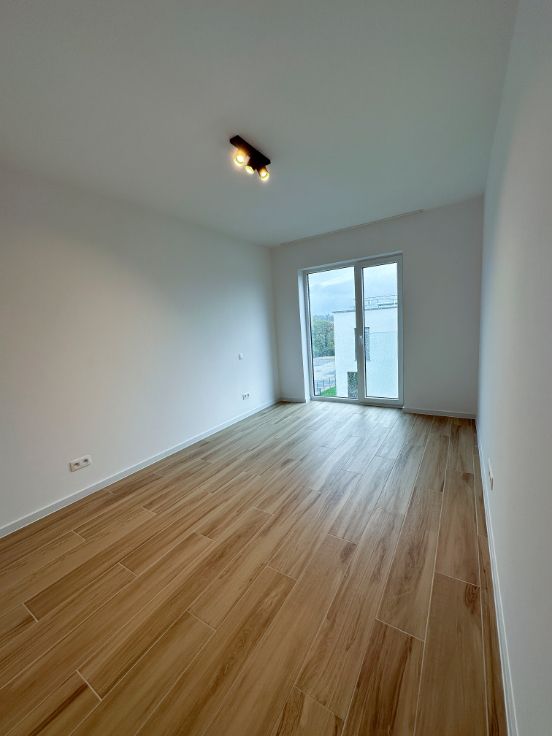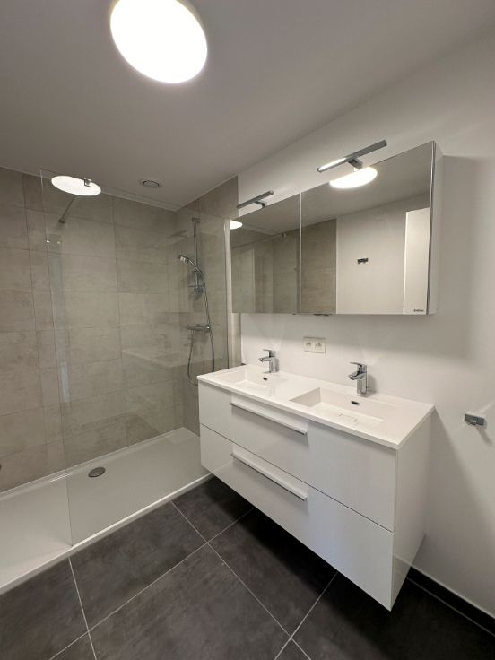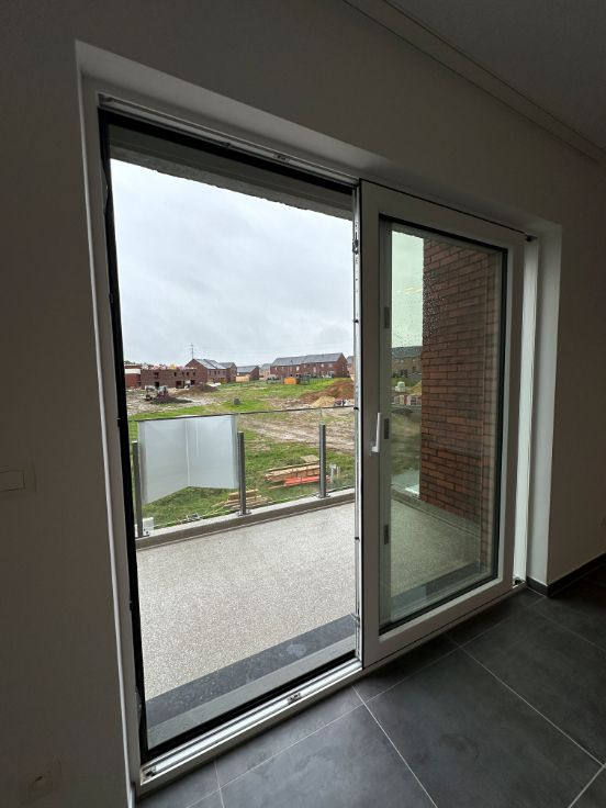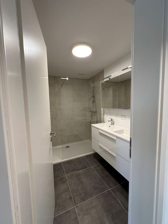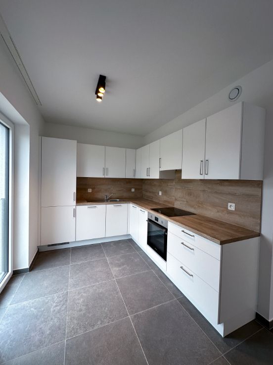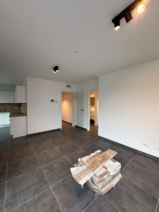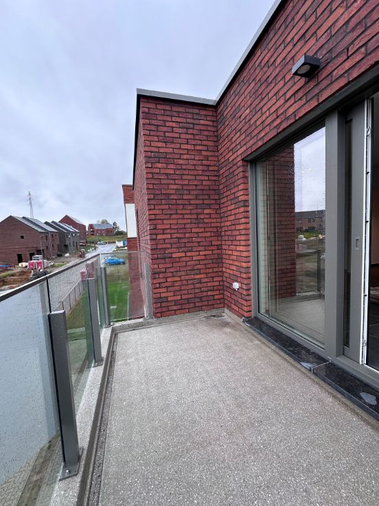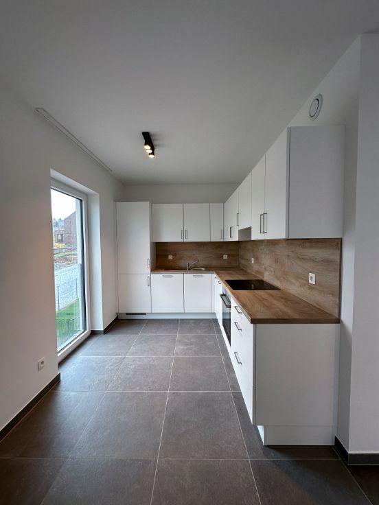 Dans une nouvelle résidence composée de 12 unités, au 1er étage, un bel appartement 2 chambres composé de : un hall d'entrée, 2 chambres, une salle de douche, un wc séparé, une buanderie, un séjour avec cuisine ouverte entièrement équipée, une terrasse de +- 8 m², un emplacement de parking extérieur privatif, un local vélo commun sécurisé.