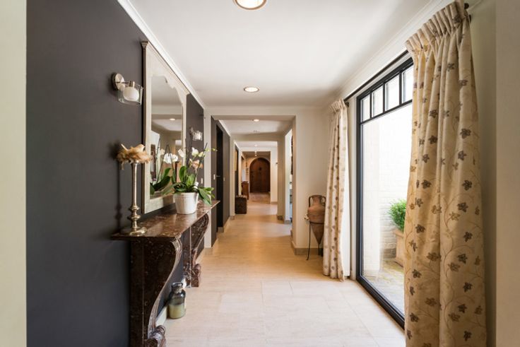 Begane grond : Portiek, inkomhal met gastentoilet en vestiaire die leidt naar alle kamers, ontvangstruimte met open haard, televisiekamer, keuken, eetkamer, familiekamer, dienstingang met toilet, garage met slaapkamer en doucheruimte, ideaal voor een vrij beroep of dienstbodekamer.
