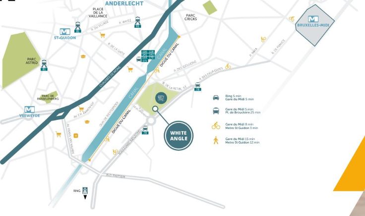 WHITE ANGLE is een slim, duurzaam en innovatief kantorencomplex in het nieuwe City Dox gebied. Het biedt 6 niveaus gewijd aan kantoorruimten, terwijl de benedenverdieping retail zal toelaten. Het ligt op 5 minuten van de Ring en het Zuidstation van Brussel, en is ook goed bereikbaar met het openbaar vervoer met een bushalte vóór het gebouw. Brede en veilige fietspaden in combinatie met beveiligde fietsdokken laten fietsers toe om veilig naar White Angle te komen, kleedkamers en douches maken het leven gemakkelijker voor fietsers. 54 parkeerplaatsen zijn ondergronds voorzien voor zowel klanten als werknemers bijkomende parkeerplaatsen kunnen gehuurd worden aan de overkant van de weg. Er kunnen laadpalen voor elektrische voertuigen worden voorzien. De binnenruimtes zijn flexibel, modulair, ruim en lichtrijk dankzij de grote plafondhoge ramen. Het dakterras is de beste plek om te pauzeren en tot rust te komen. Een passief gebouw dat beantwoordt aan de hoogste energieprestatienormen en uitgerust is met slimme technologieën. Slimme verlichting : Leds gedimd per kwart-zone afhankelijk van de lichtsterkte. Warmtepomp (omkeerbaar) voor efficiënte airconditioning. Het thermisch geactiveerde valse plafond zorgt voor thermisch comfort in winter en zomer. Een tank vangt regenwater op om de toiletten te bevoorraden.  De EPC-resultaten van het gebouw zijn uitstekend met gemiddeld K = 36 en E = 50. Renovatieplicht: onbekend